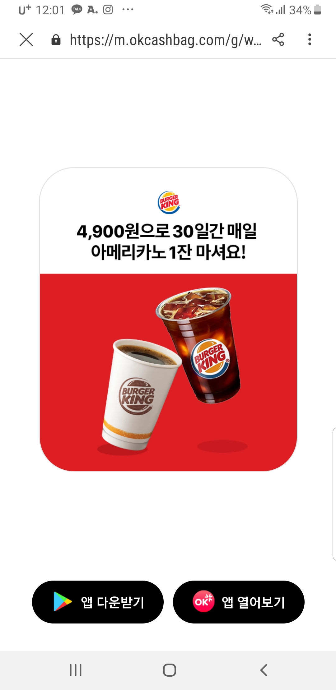 오케이캐쉬백앱에서 버거킹 아메리카노 30일 4900원 > 자유게시판