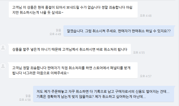 "솔직하게 페널티 받으니 너그럽게 이해해달라고 말한" 것은 마지막에 가서입니다. 앞에서 이미 두번 바르지 못한 안내를 시도한 후에요... 첫문장에 대해서 바로 따지지 않았고 그저 "그쪽에서 취소처리 할 수 있지요?"라고 판매자 취소할 수 있는거 알고 있다고 말을 했는데도 다시한번 다른 설명 없이 구매취소 하라는 식으로 나왔다가 뭔가 아차 싶은지 잠시 후에 부탁조로 태도를 바꾼겁니다.