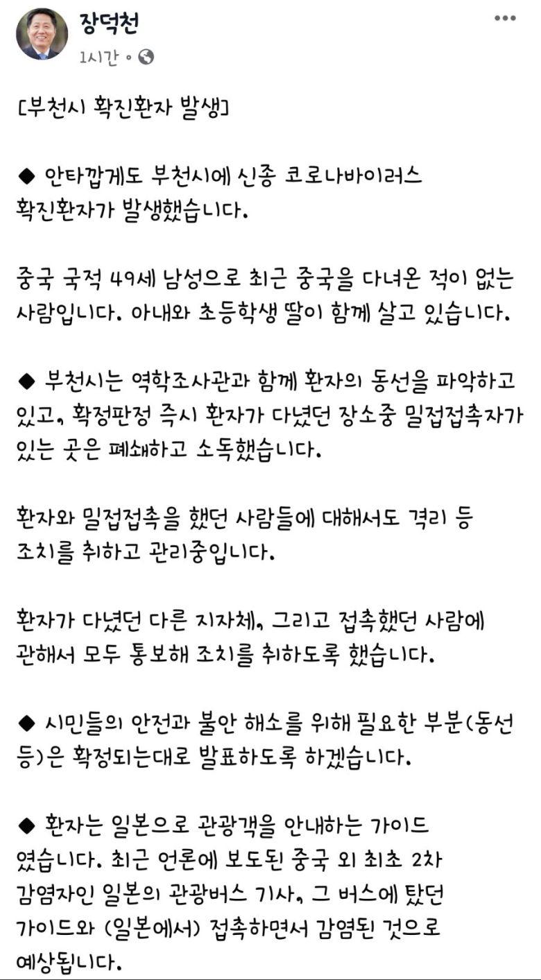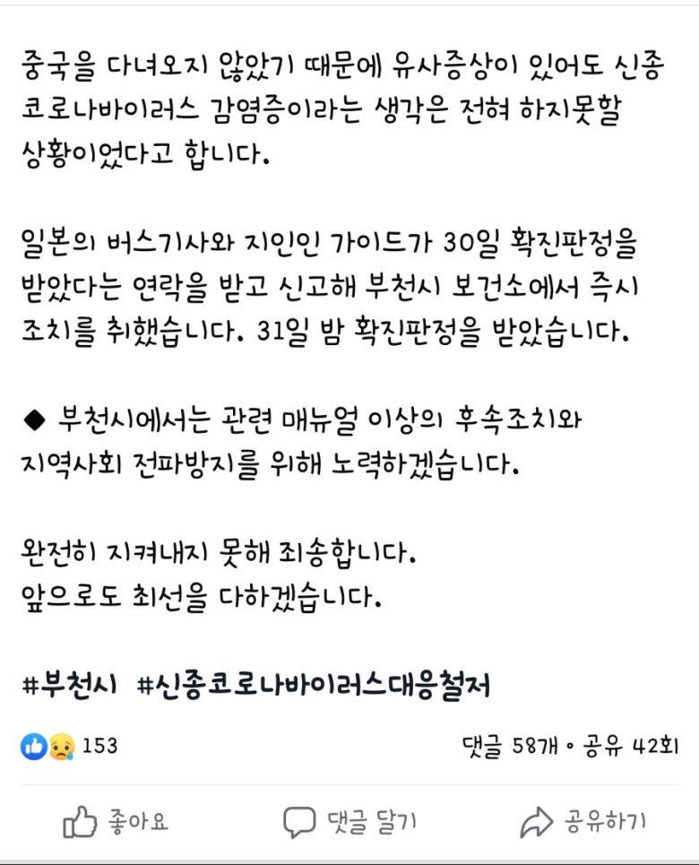 ○ (1월 30일) 다섯 번째 확진환자의 접촉자로 통보 받고 자택에 머무름