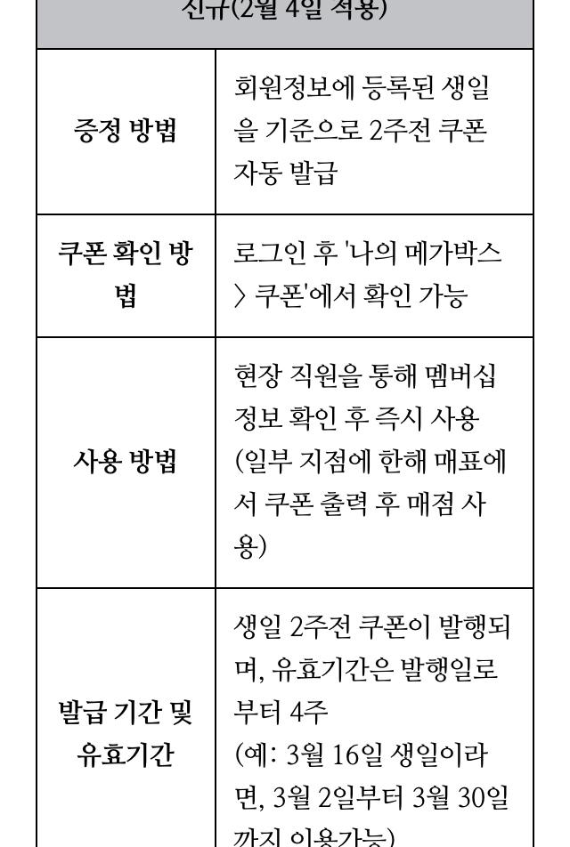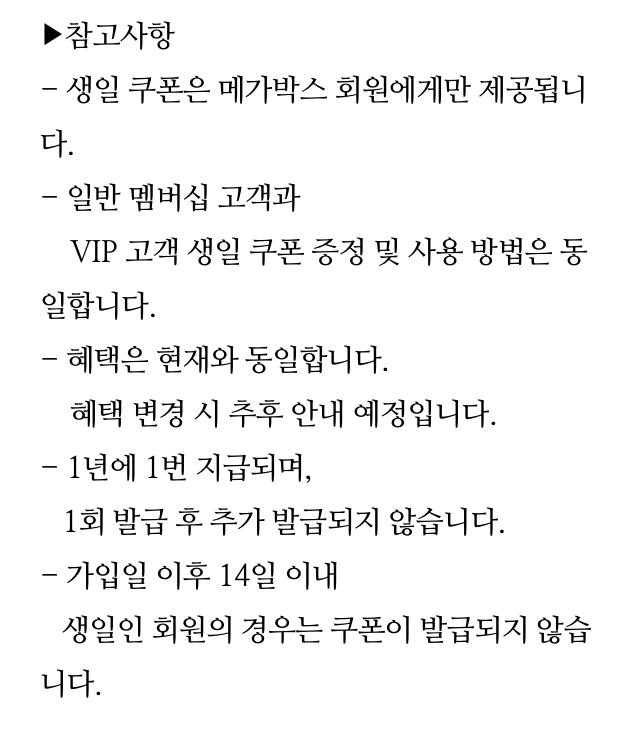 작년에 깜빡하고 생일쿠폰 못썼는데 이달로 날짜 변경해서 사용 가능한건가요? (한해 지나서 끝난줄) 그나저나 많이 바뀌는군요. 공지 잘 안봐서 몰랐는데 ㅠㅠ 정보 감사합니다~ |