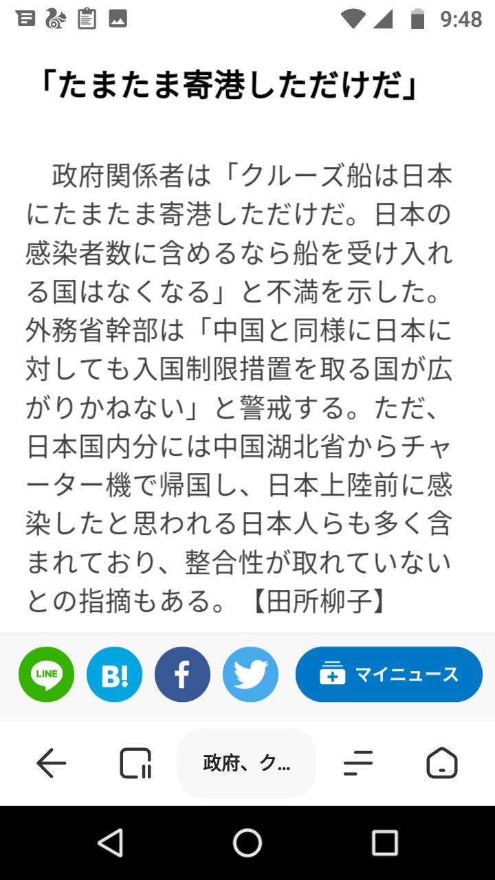 정부 관계자는 크루즈선은 일본에 우연히 들렀을 뿐이다. 일본의 감염자수에 포함시킨다면 배를 받아 들이는 나라는 없어진다"고 불만을 나타냈다.