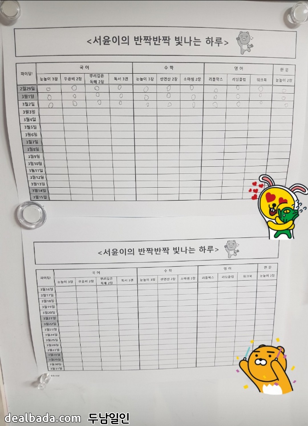 아이가 이것저것 열심히네요. 저도 일일계획표 짜야 할까봐요.. 또르르... |