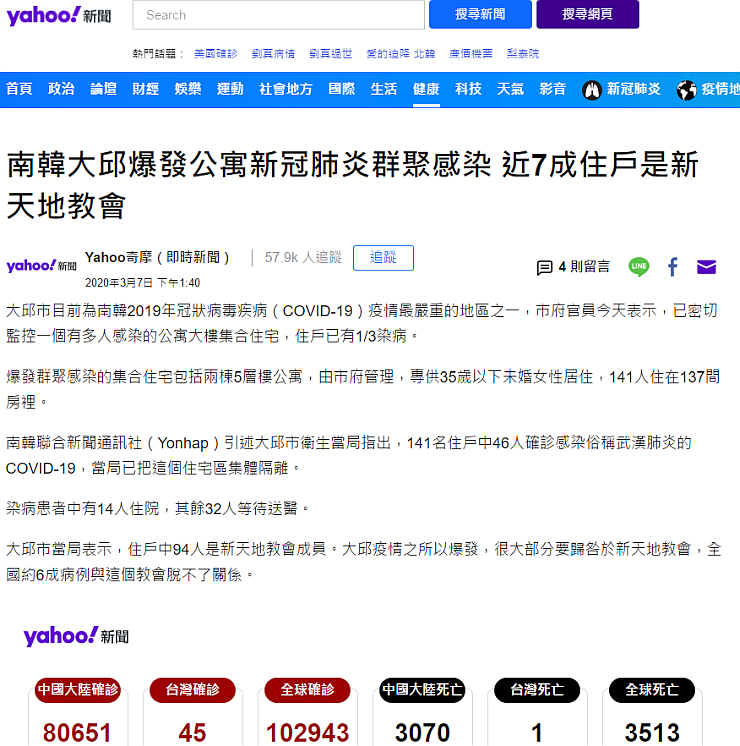 대구시 당국은 94 명의 거주자가 신천지교회(新天地教會) 신도들이라고 밝혔다.