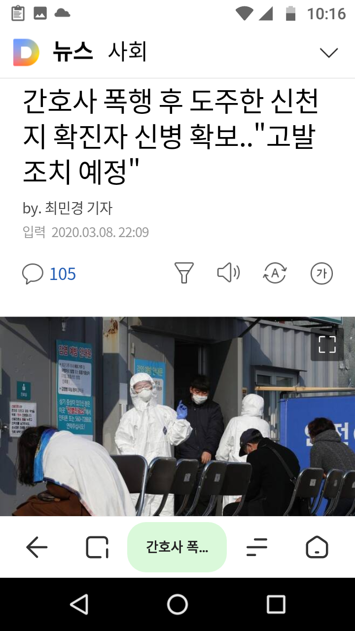 간호사 폭행 후 도주한 신천지 확진자 신병 확보.."고발 조치 예정" | 다음뉴스