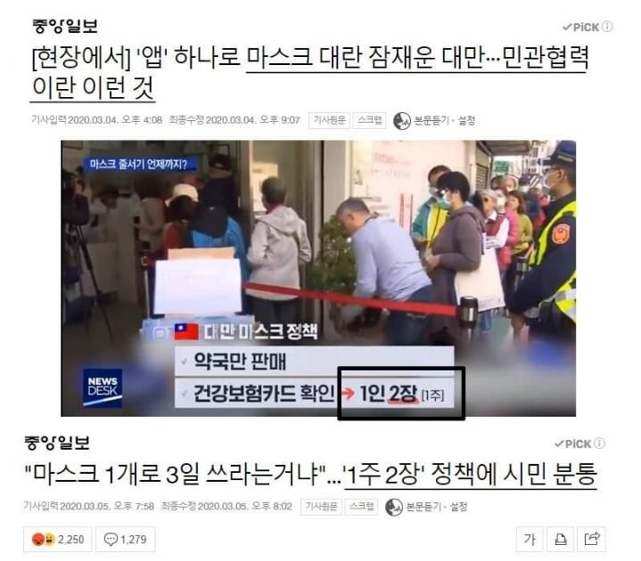 대만은 1주일에 한 번씩 약국에서 건강보험카드가 있어야 제한된 수량의 마스크를 살 수 있는 실명제 구매 정책을 지난달 6일부터 일찌감치 시작했다. 1월 말~지난달 초 마스크 부족 현상이 나타나자 정부가 발 빠르게 움직여 사실상 마스크 배급제를 실시한 것이다. 정부는 약국마다 마스크가 얼마나 남았는지 한 눈에 보여주는 어플리케이션도 개발했다.