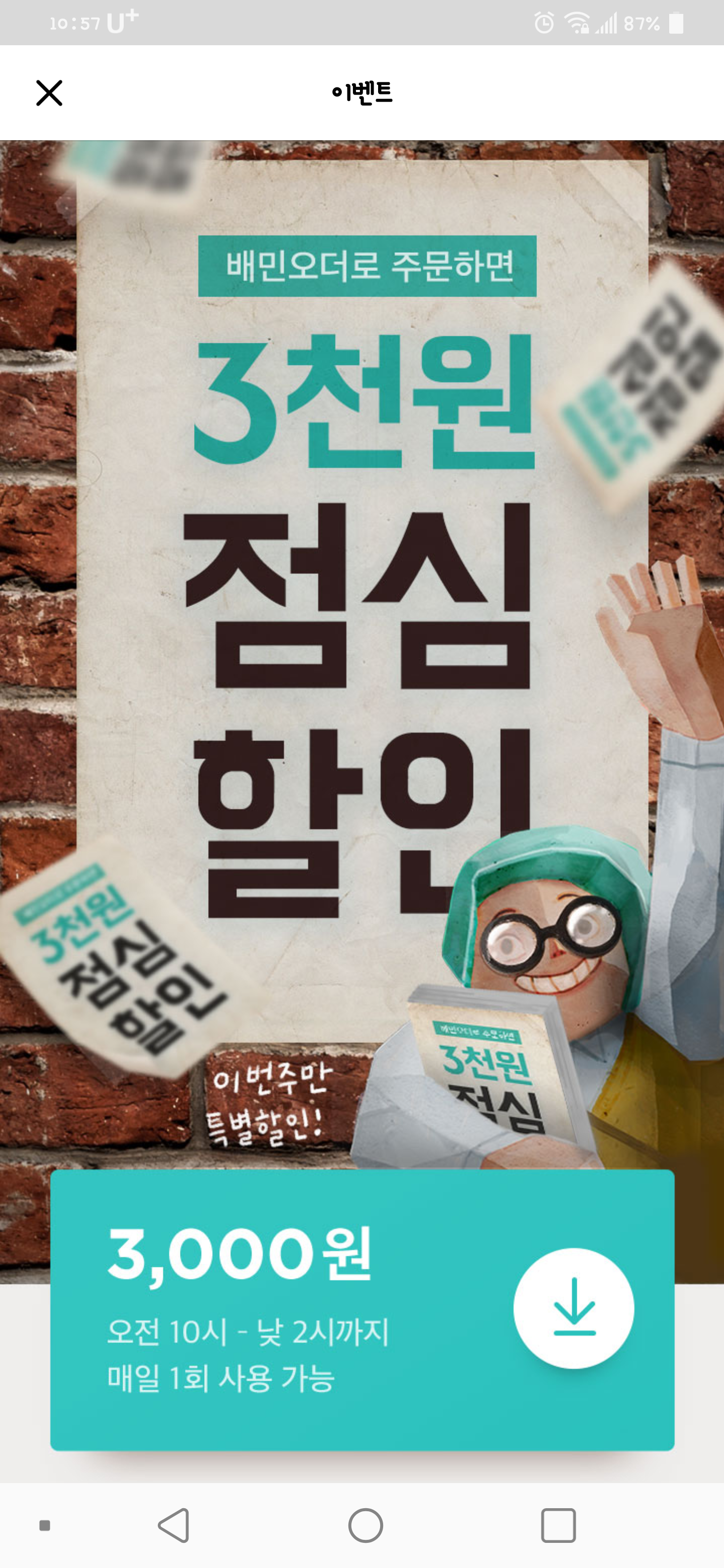 예전에 한 번씩 하던 배민오더 매일 1회 5천원 이상 3천원 할인 행사가 최근엔 올데이 천원, 점심에만 2천원 할인으로 바뀌어 사용 안하고 있었는데 이번주에 다시 3천원 할인으로 바뀌었네요^^
