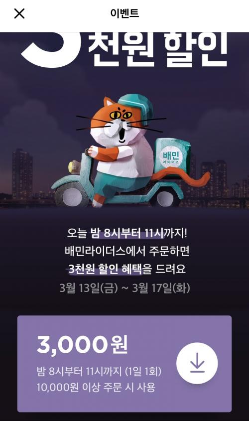 배민오더, 배민라이더 20시~23시 만원이상 3천원할인(~내일까지) > 자유게시판