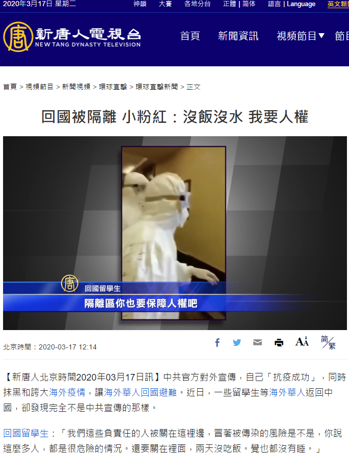 귀국유학생: "우리는 여기 갇혀 있고(격리되어 있고), 전염될 위험을 무릅쓰는 게 아닌가. 모두 위험한 상황이다. 또 안에 갇혀 있어야 하는데 이틀 동안 밥을 못 먹었다. 잠도 못 잤다."