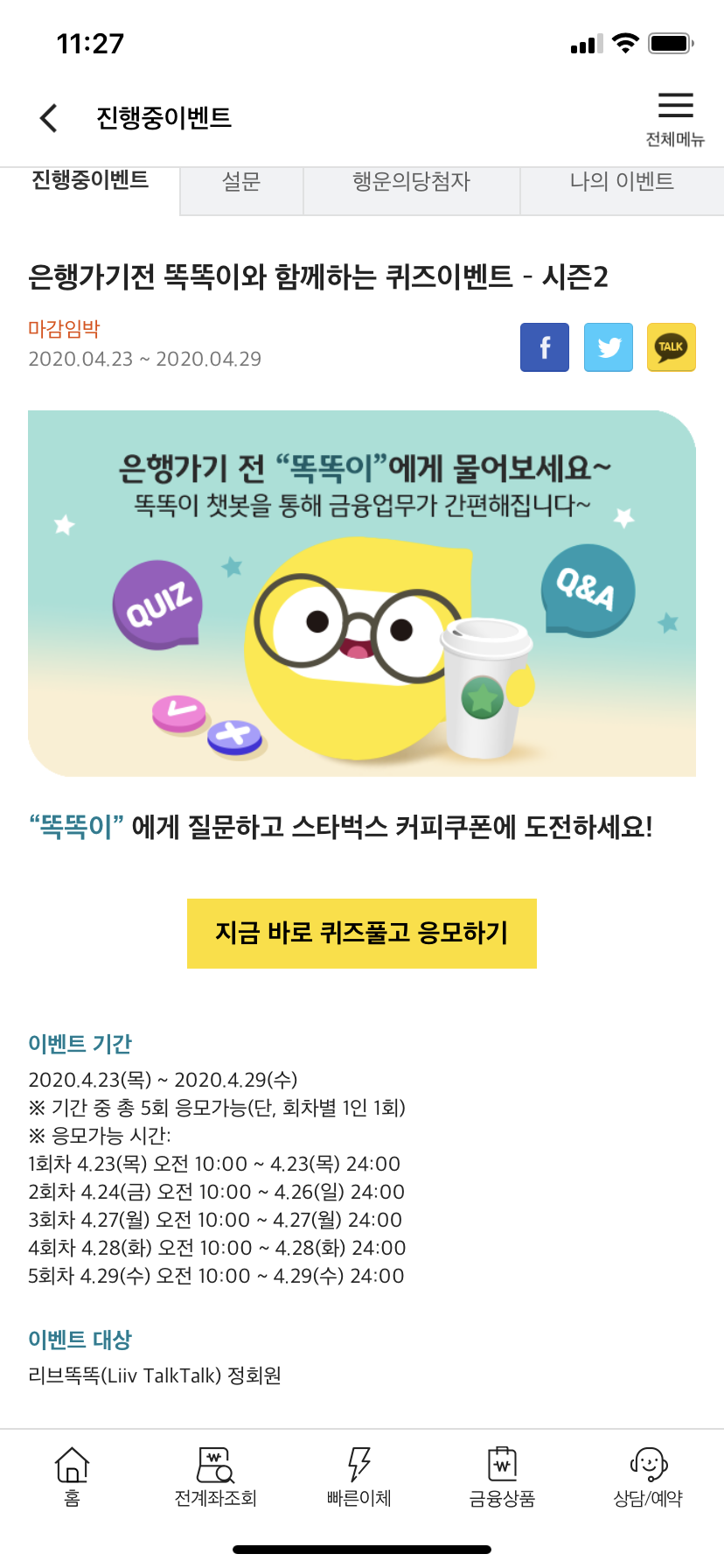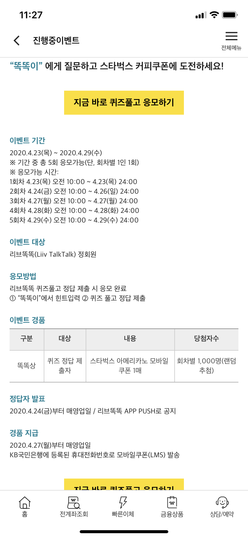 2. KB스타뱅킹 앱들어가서 진행중 이벤트 보니깐 은행가기전 똑똑이와 함꼐하는 퀴즈이벤트 시즌2 있습니다