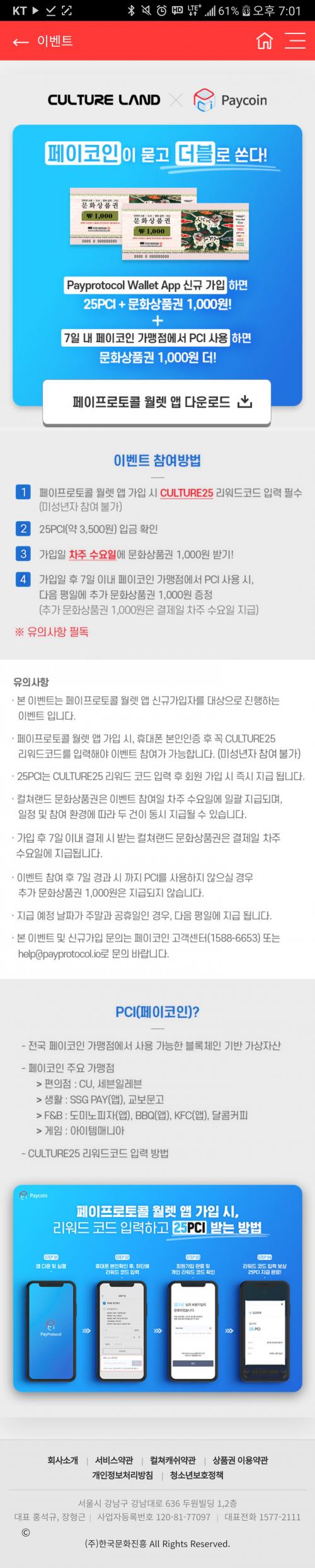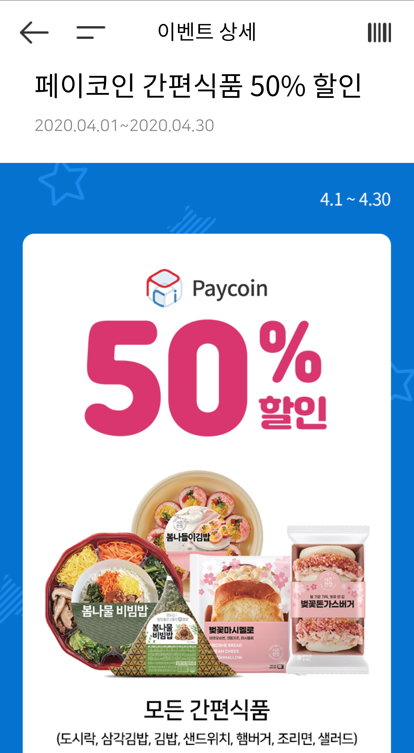 저도 22일에 도미노 배달 50프로 할인 행사할 때 페이코인 가입했어요.^^ 컬쳐랜드 리워드로 25코인 받았는데 담주 수욜인가에 1천 컬쳐 추가로 준다고 하더라고요.ㅎ 어제 CU에서 간장불고기김밥인가 2,500원짜리 사면서 페이코인 바코드 내밀고 찍었더니 1,250원 결제되더라구요.ㅎ | ||