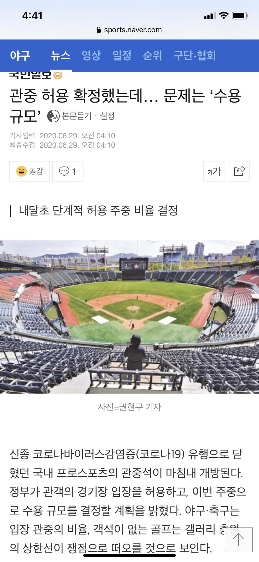개학도 충분한 고려없이 강행해서 여기저기서 터지는 마당에 스포츠관람까지 푸는건 좀 무모해보이네요. |