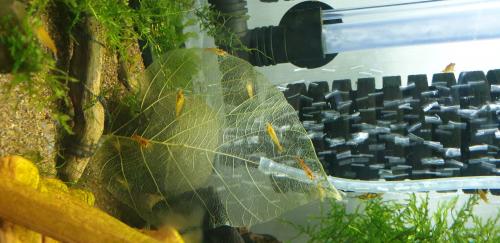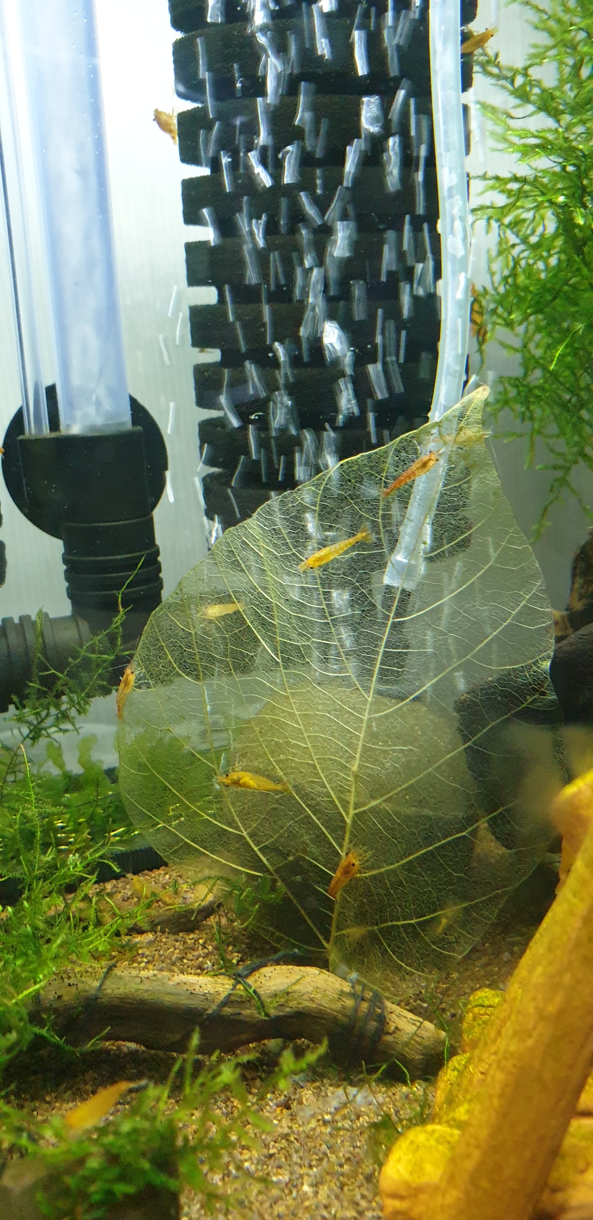 생이새우 맞나요? 약간 노란게 노랭이 같기도하고... 칡잎, 뽕잎, 고구마잎 삶아주면 새우들이 아주 좋아하죠. | ||