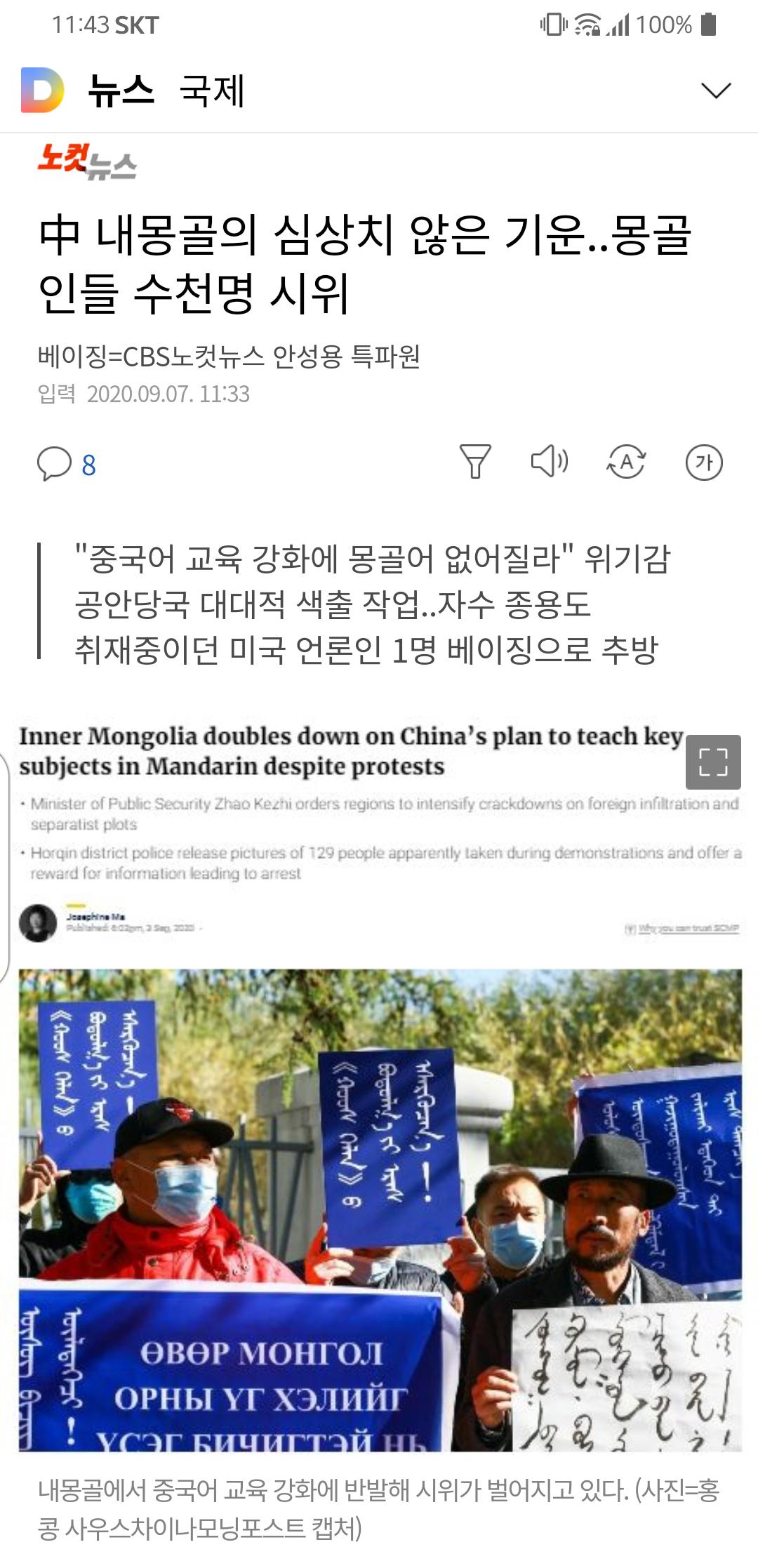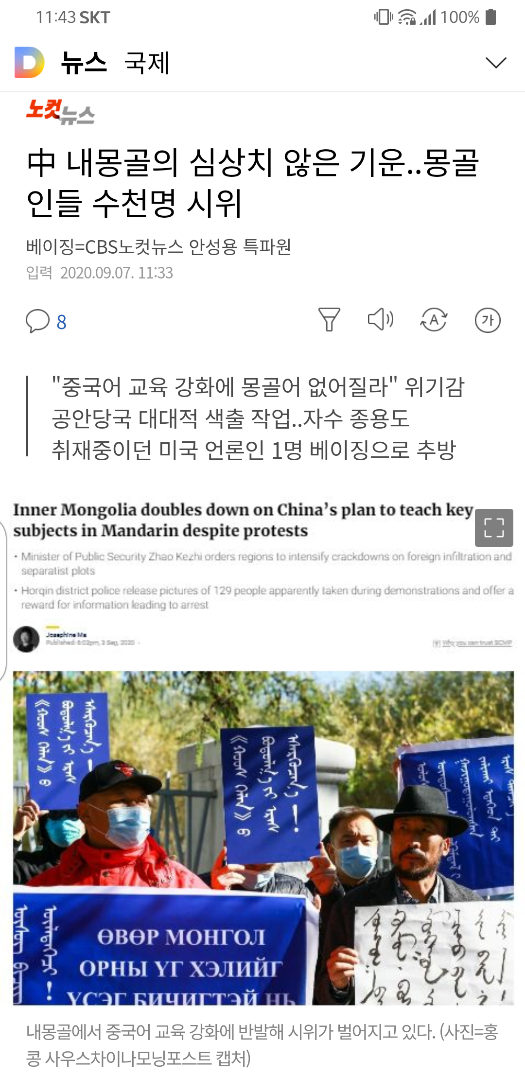 정작 몽골에서는 키릴 문자 쓰는데 내몽골에선 예전 문자 그대로 쓰나보네요. 어쨌든 유혈사태 번질 정도로 사태가 커지면 몽골에서도 가만히 보고 있을수만은 없을거고 국제문제로 번질 가능성도 적지 않아 보이네요. |