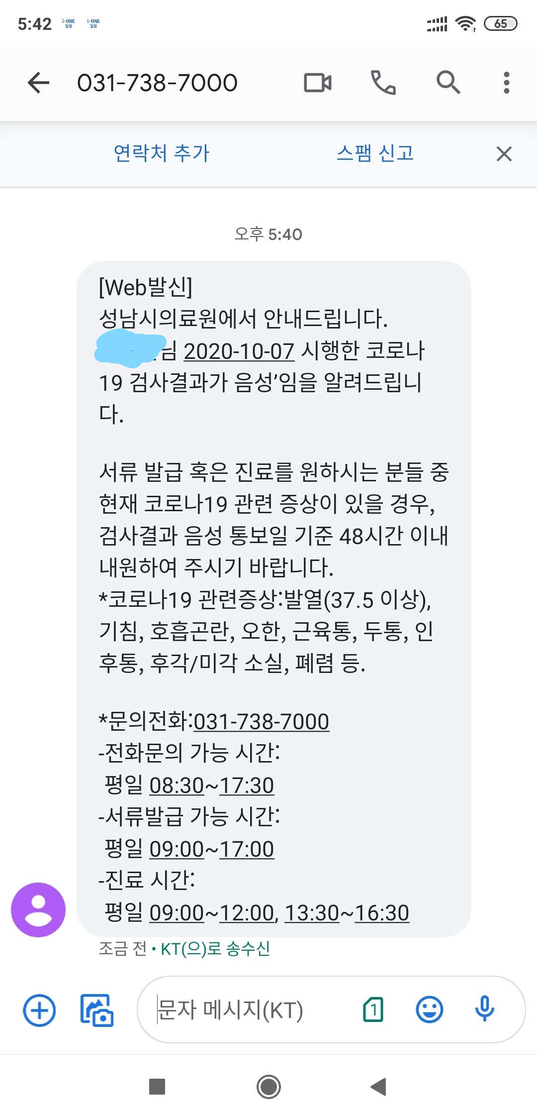 오늘 아침에 검사받고 온거 통보 받았거든요.