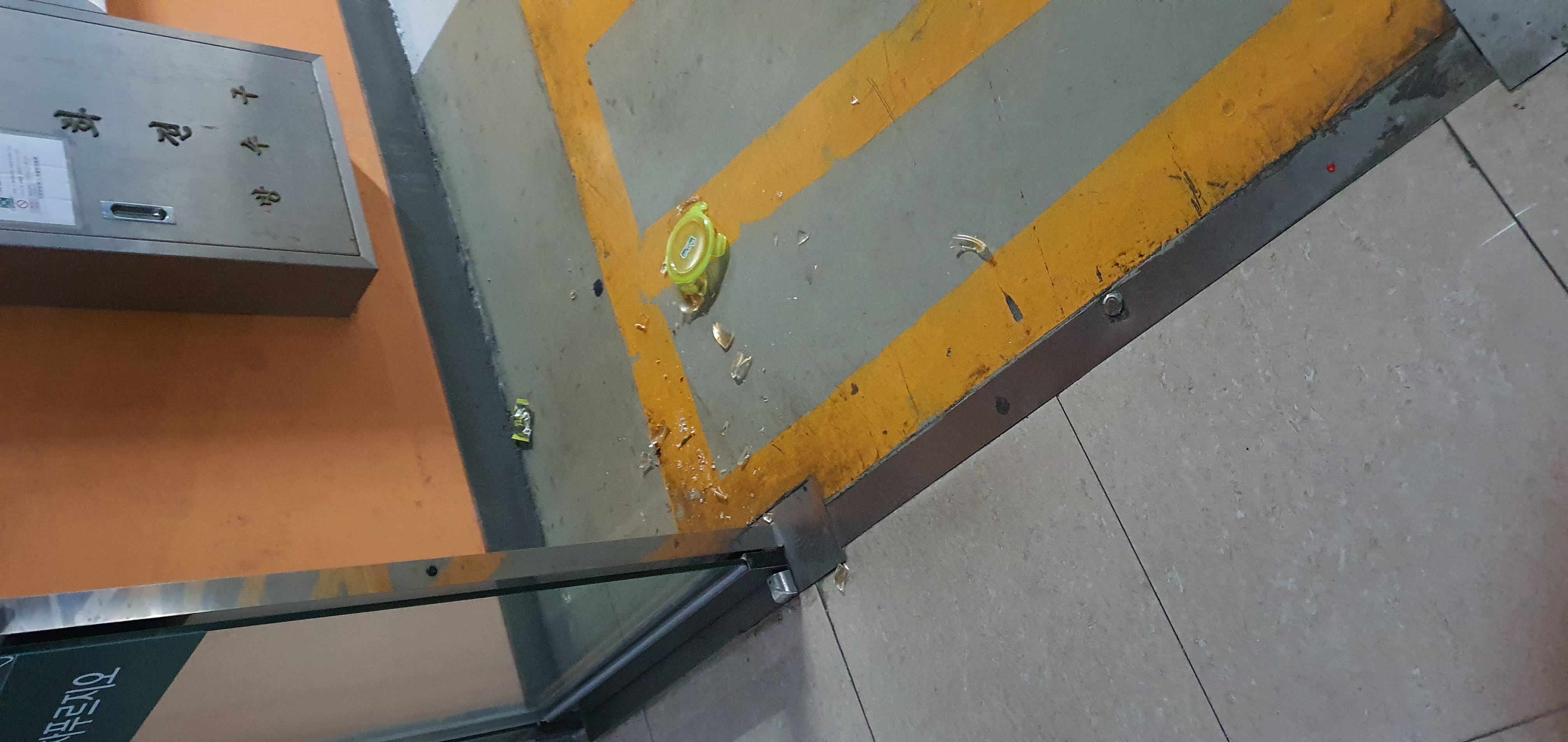 아파트 입구에 뭐가 떨어져 있어 봤더니, 아파트 입구에 유리 락앤락을 떨어트려 저렇게 만들어두고