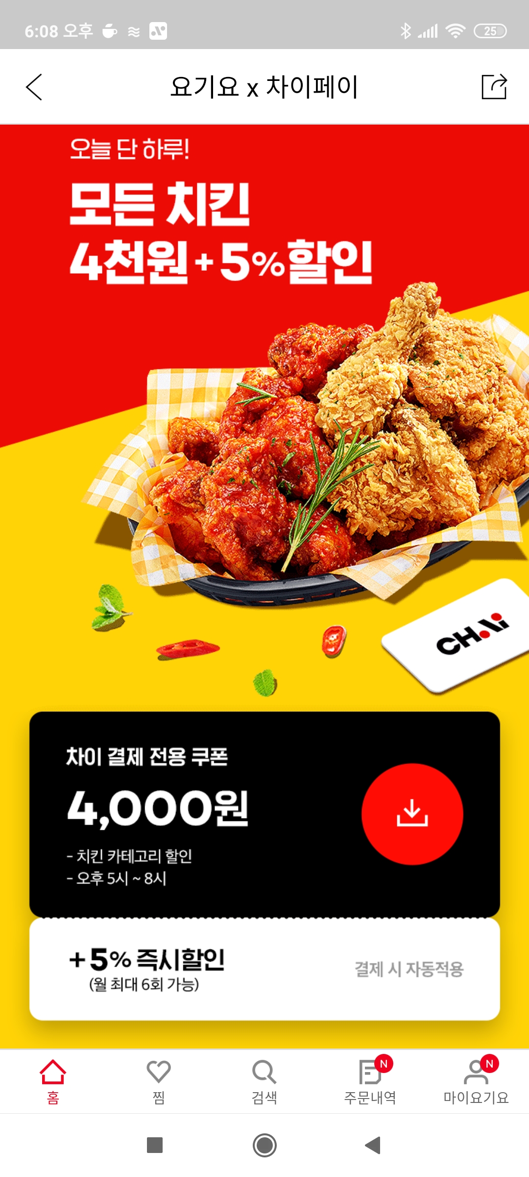 요기요 차이 결제시치킨 4천원 할인 저녁8시까지 > 자유게시판