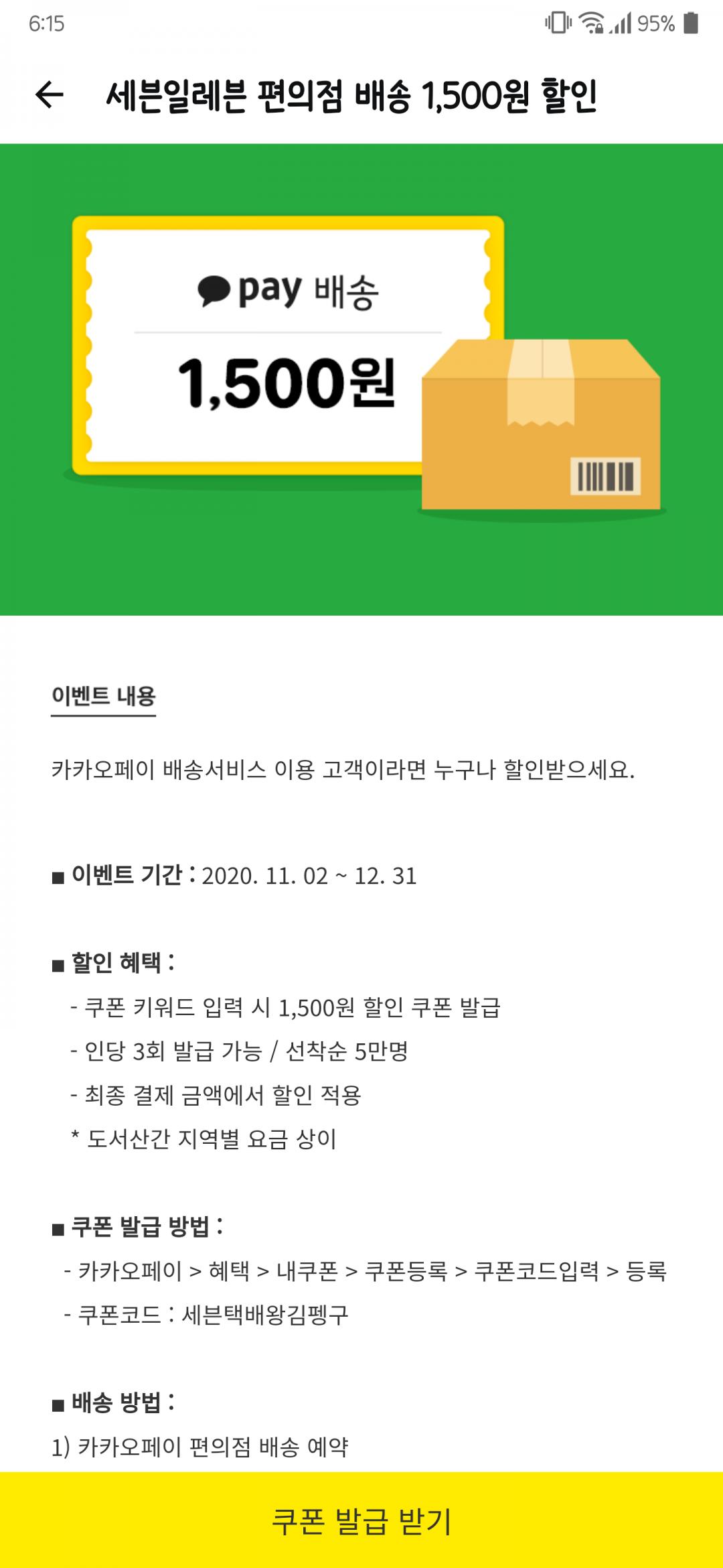 거기에서 배송비 천오백원 쿠폰할인 누르신 다음에 쿠폰코드에 '세븐택배왕김펭구' 라고 입력하시면