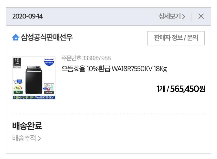 9월 25일 이사에 맞춰서 주문한 1등급 가전제품 (건조기, 2등급 통돌이 세탁기, 김치냉장고)을