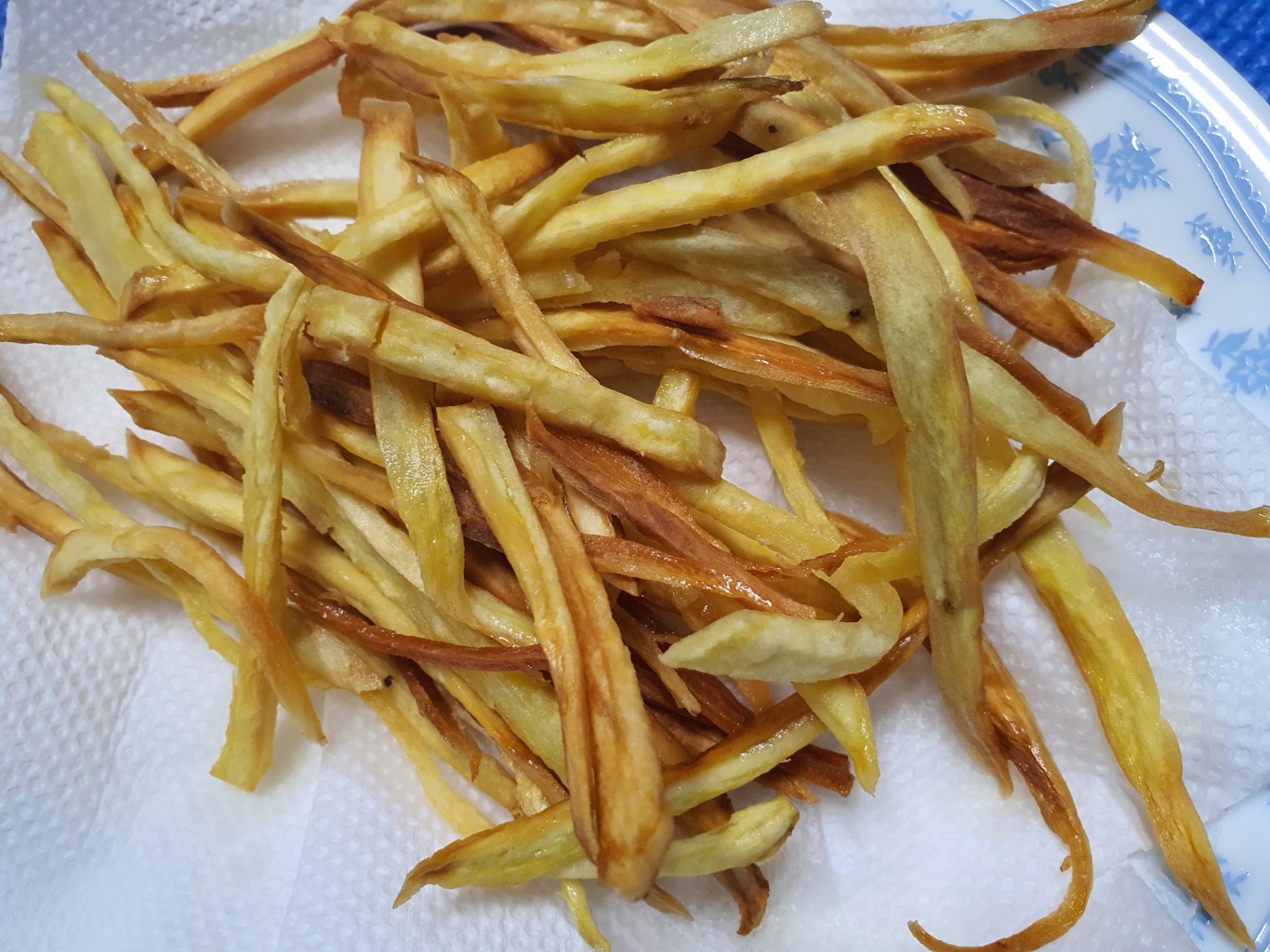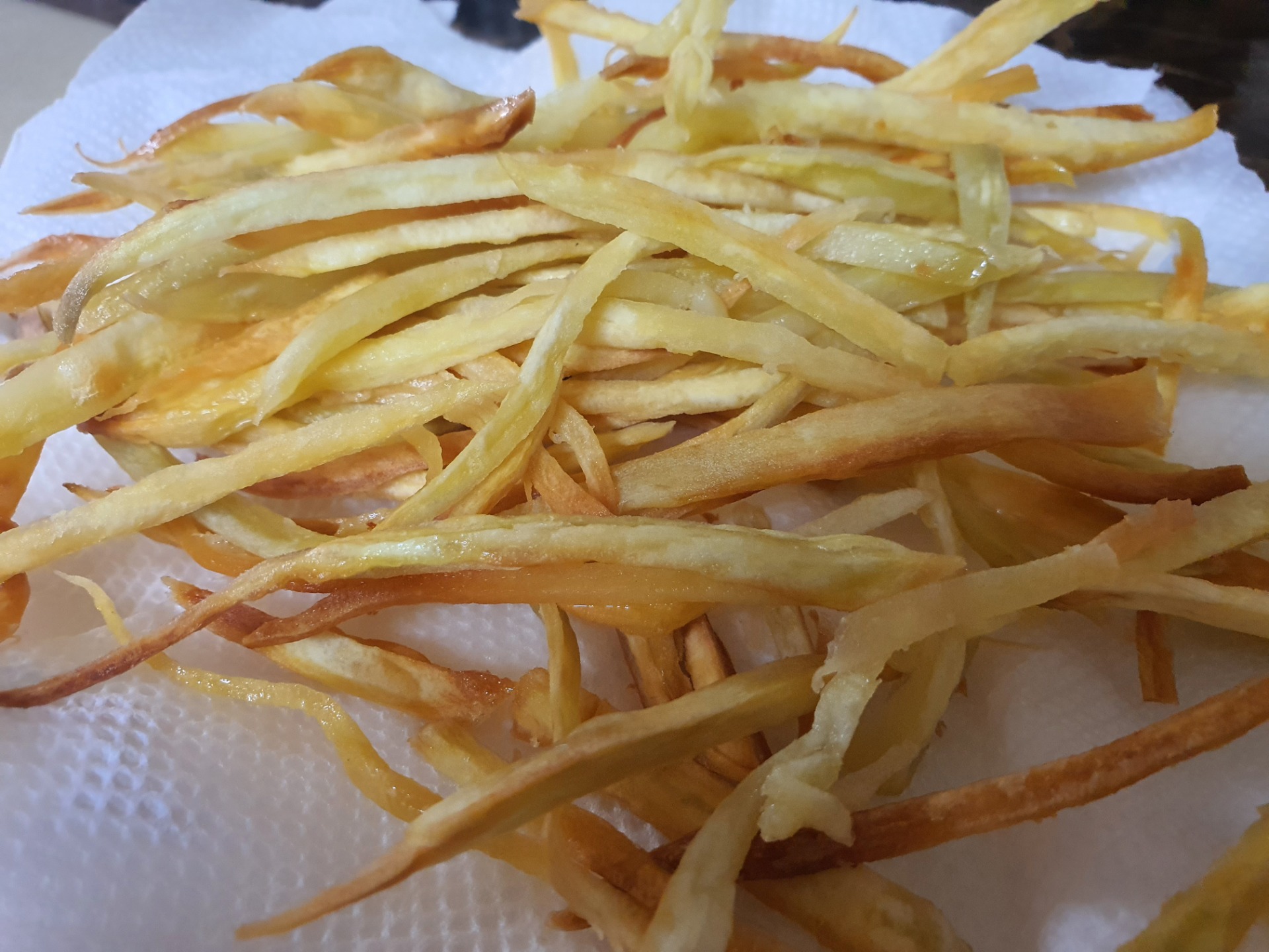 지인이 튀김용 고구마 큰걸 4개나 줘서 2개만 채썰어서 튀기는중입니다. 설탕물에 담궈 전분기 빼고 물기빼서 튀기는데요.