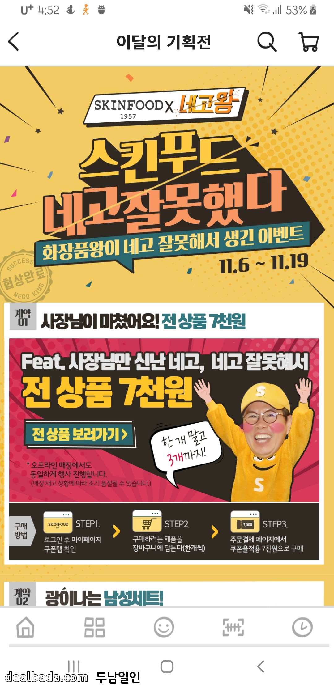 회원에 한해 스킨푸드 전제품을 7,000원에 쿠폰 3장을 발행해주네요. 다른 이벤트도 있는데 선착순이라ㅠㅠ