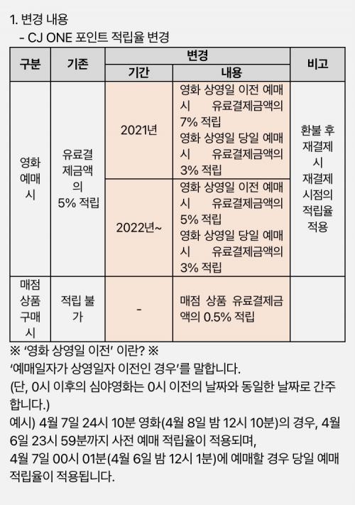 CJONE 포인트의 경우 내년엔 예매분에 대해서만 상향 당일분은 하향이고 내후년엔 전체적인 예매분도 원복이네요