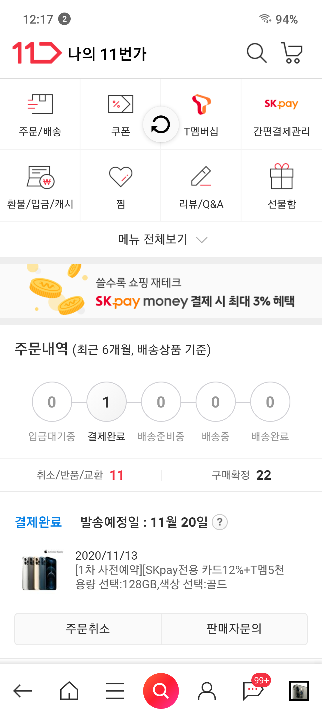 오.. 축하드립니다. 저도 오늘 11번가 SK기변 프로맥스 실버 256 한대 도와주고
