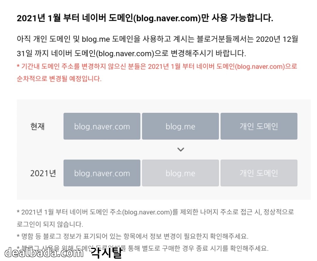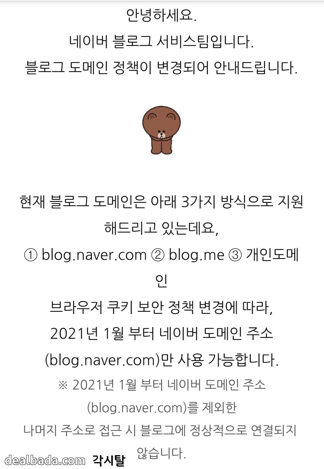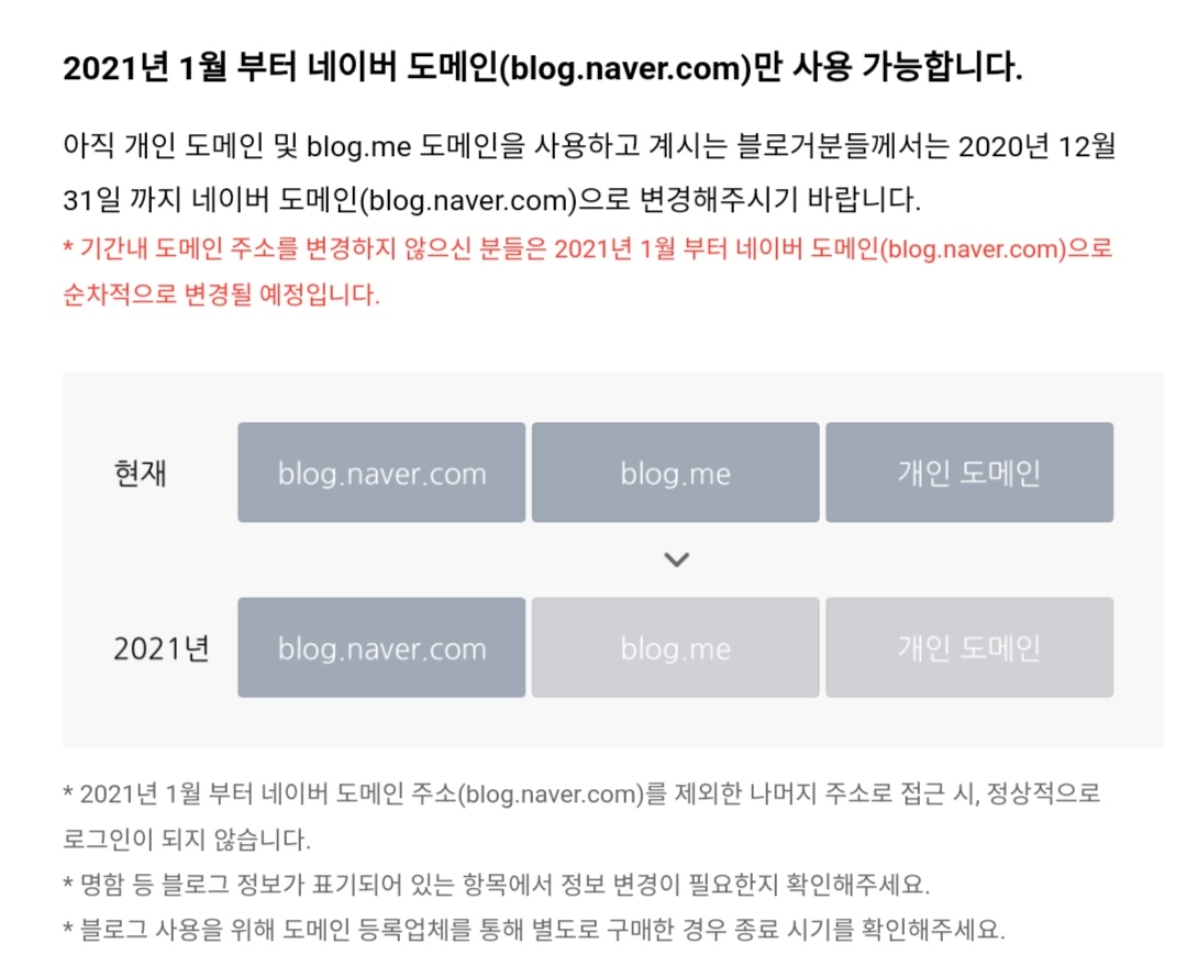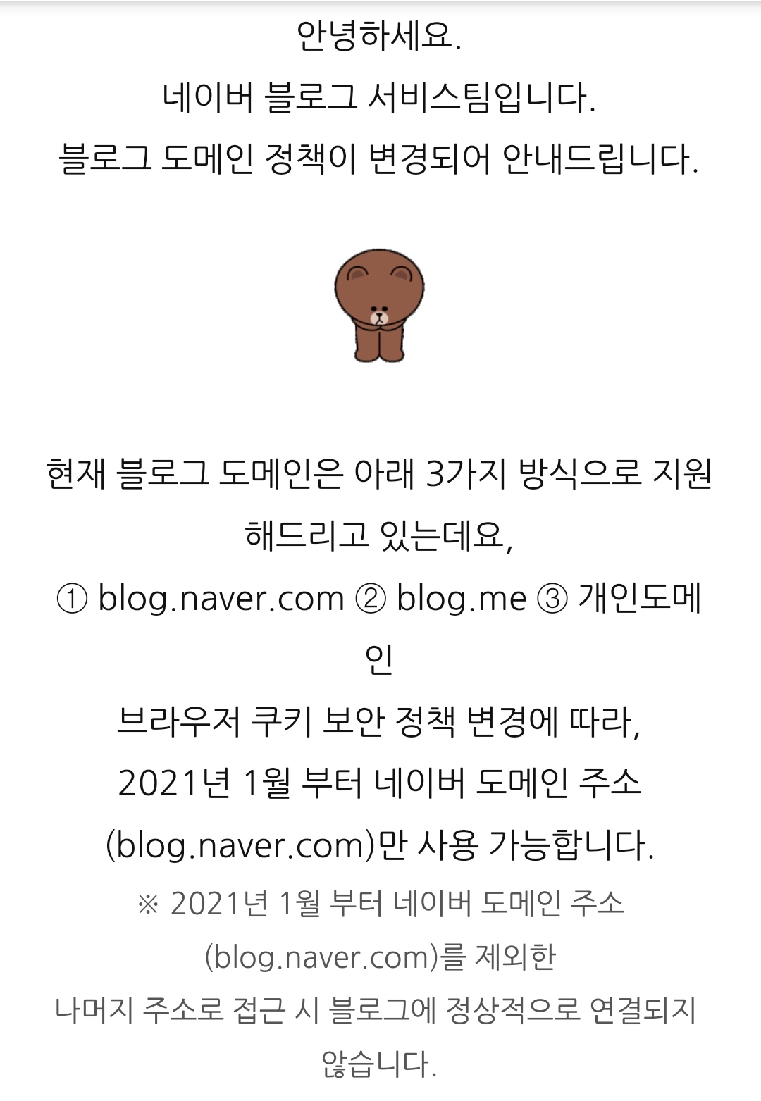 개인 도메인이면 별도의 서버를 구축해서 redirect 시키는 식으로 우회라도 가능하지만, blog.me 도메인을 쓰던 사람들은 한마디로 망했어요. 2021년 1월 1일부터 blog.me 주소로는 아예 접근이 안 될 예정이니 blog.me 도메인을 박아둔 전단지나 명함, 출판물 등은 한 순간에 쓰레기가 되는 것이다...."