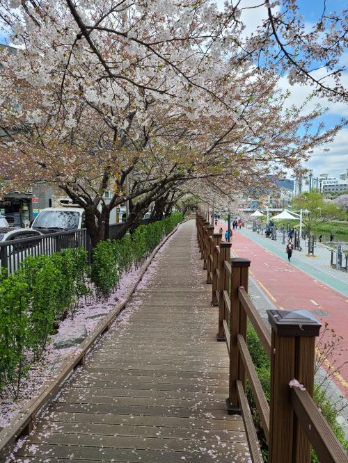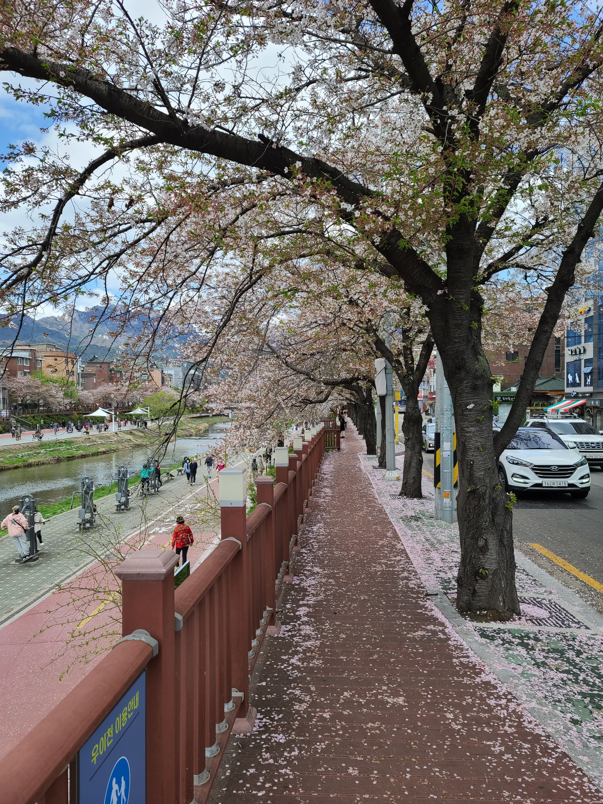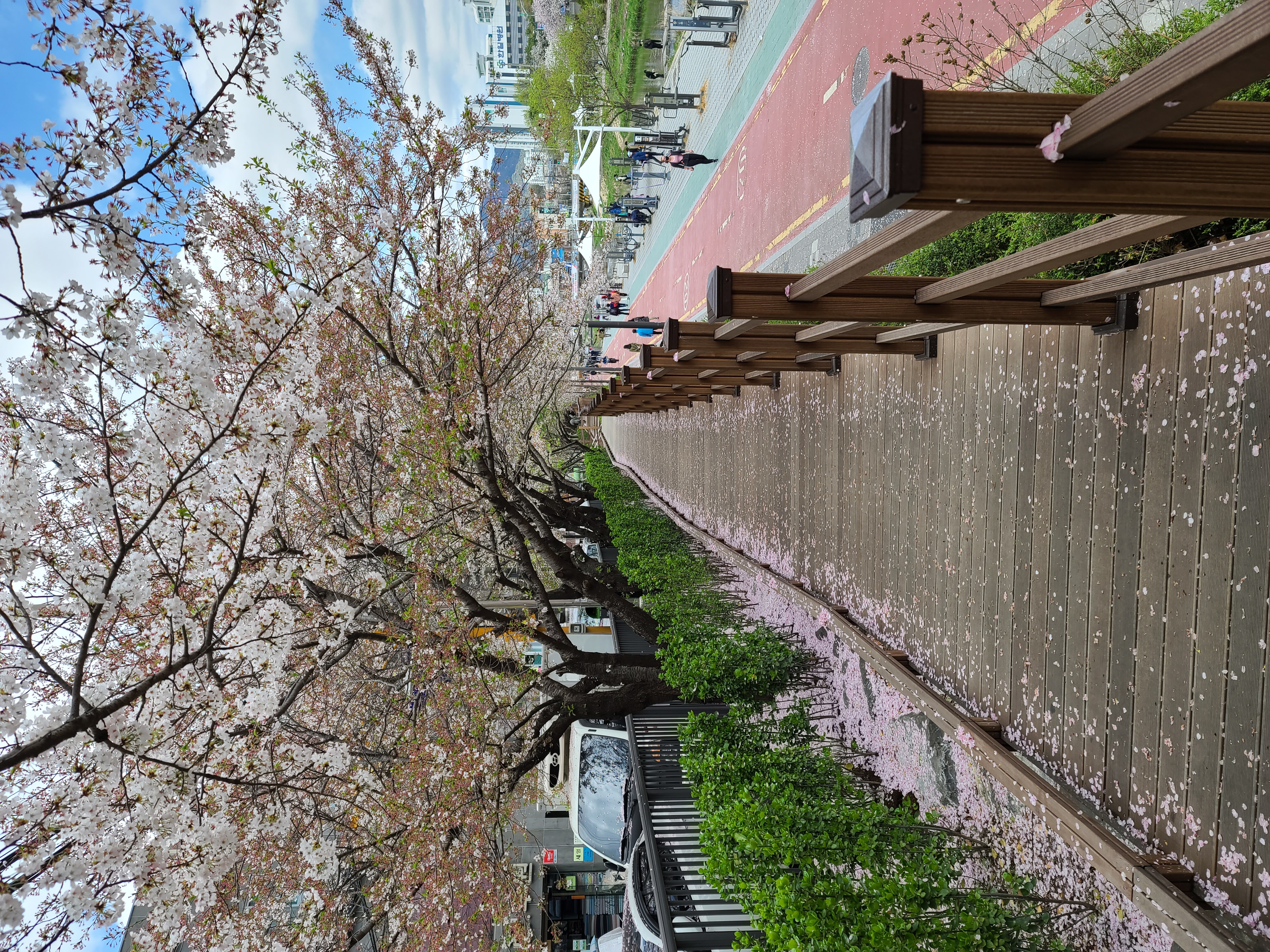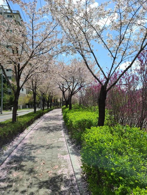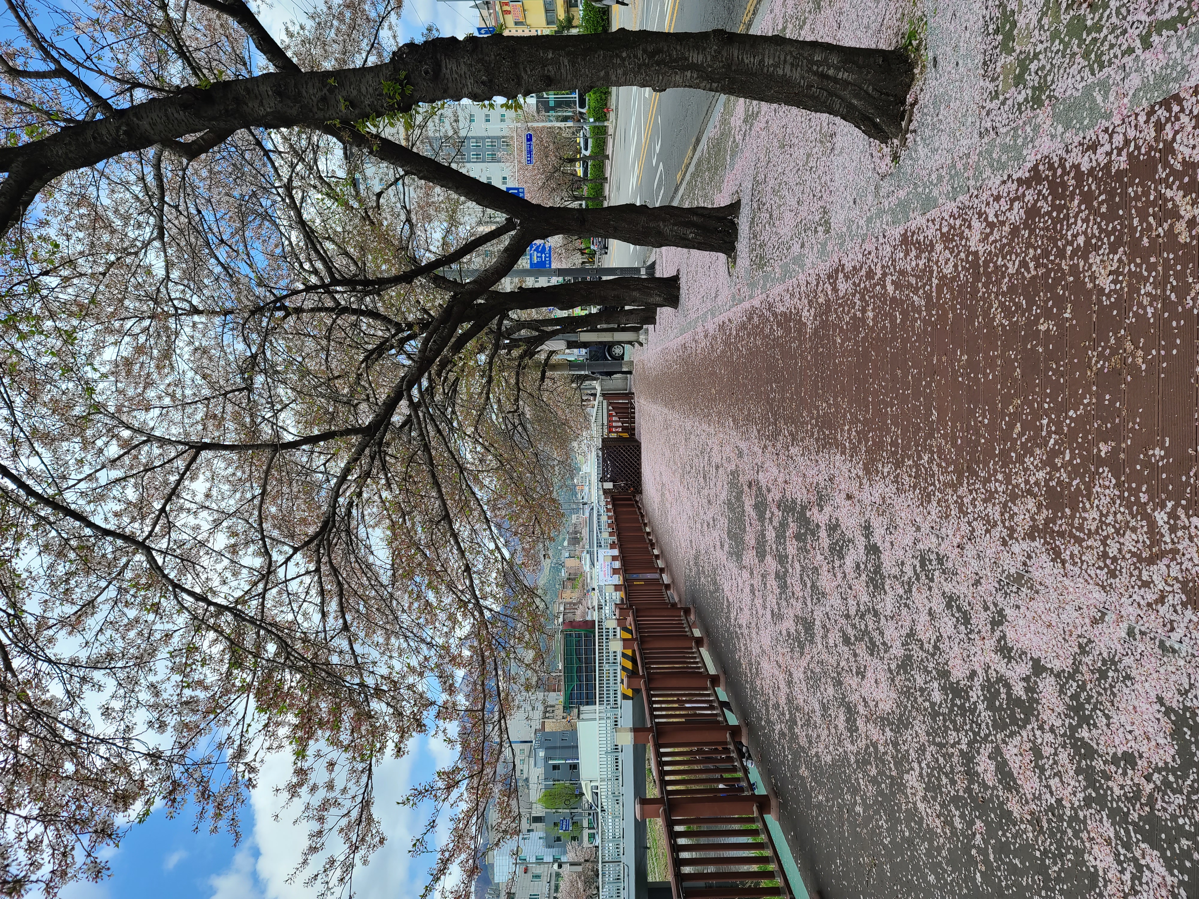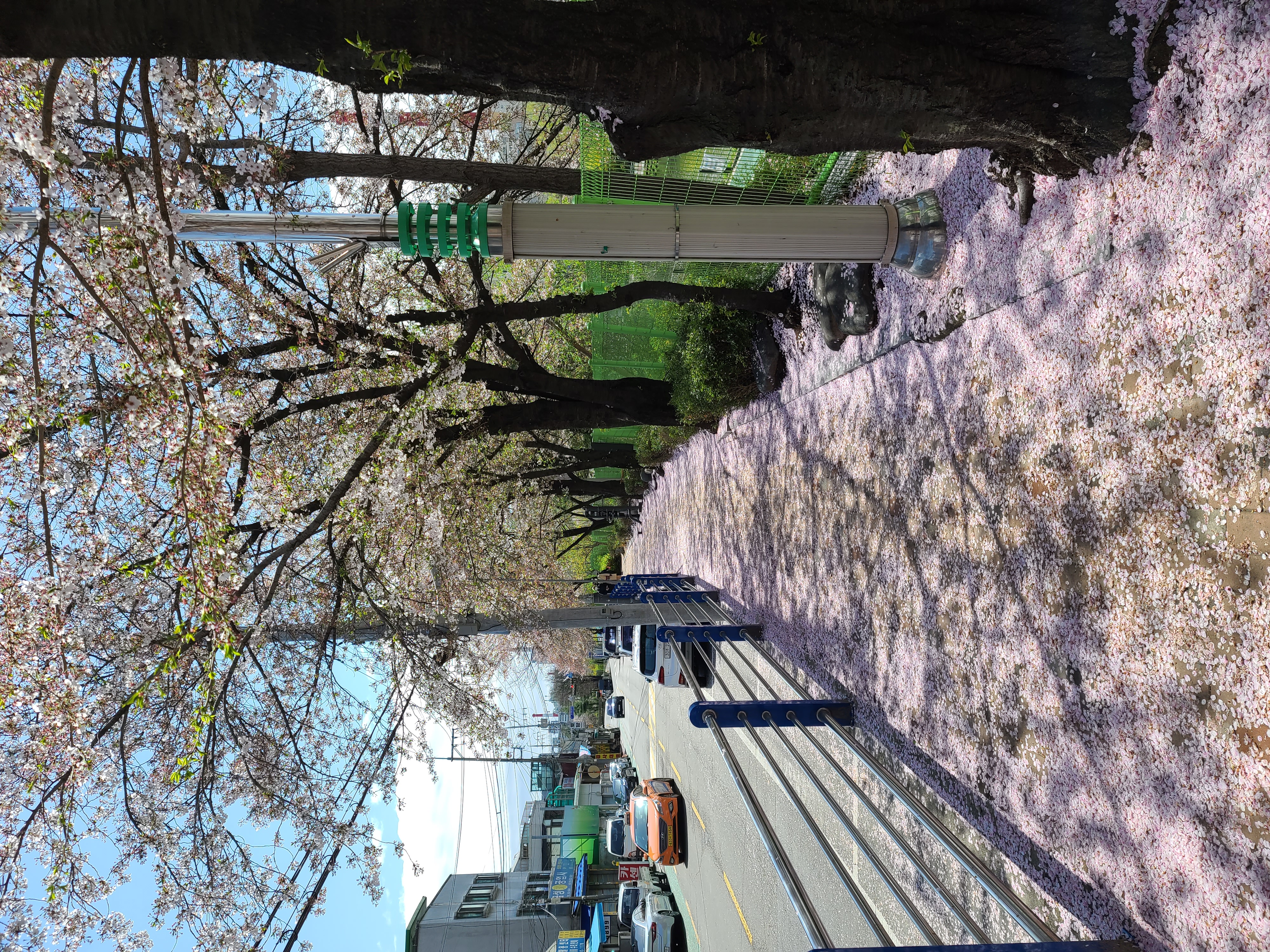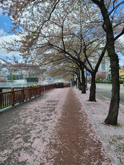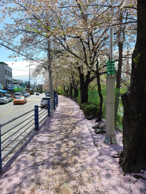나무에 있는 벚꽃보다 길가에 떨어진 벚꽃잎이 인상적이네요 꽃길을 걸으셨을거 같은데