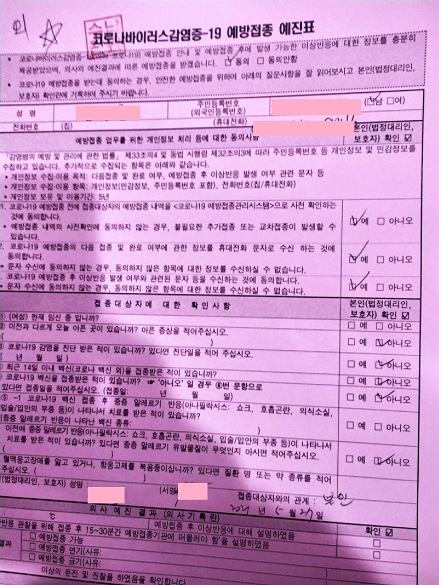 부랴부랴 해당 병원에 도착하니, 온도 체크와 빨간색 예진표 작성하고,