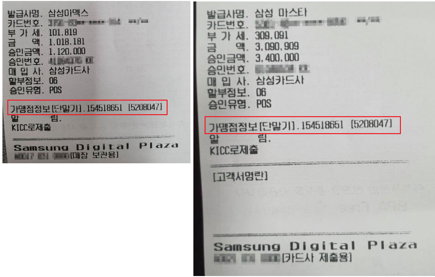 가맹점 정보가 같아요 같은 단말기에서 뽑은듯