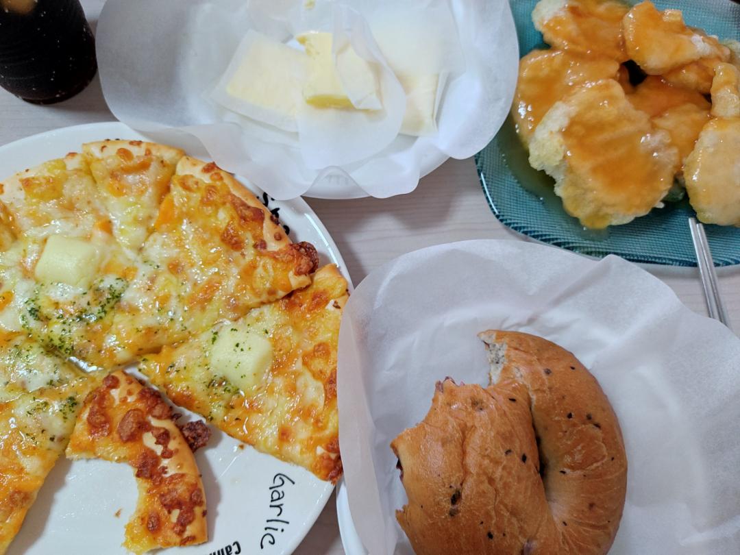 지금 점심으로 먹을 노엣지피자에 무염버터에 베이글 한개랑 이마트표 꿔바로우입니다..