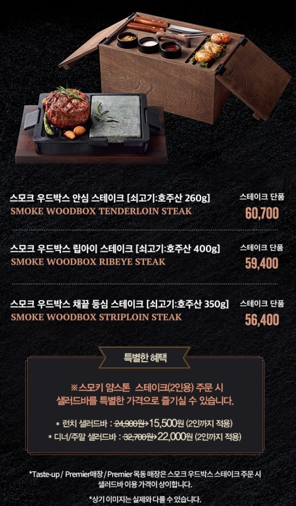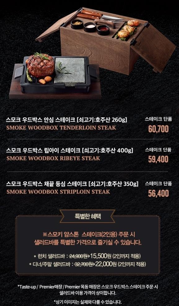 오늘 스모크박스 립아이 스테이크 59,400원 + 성인2명 샐러드바(우드세트 할인) 44,000원+초등2명 32,800원