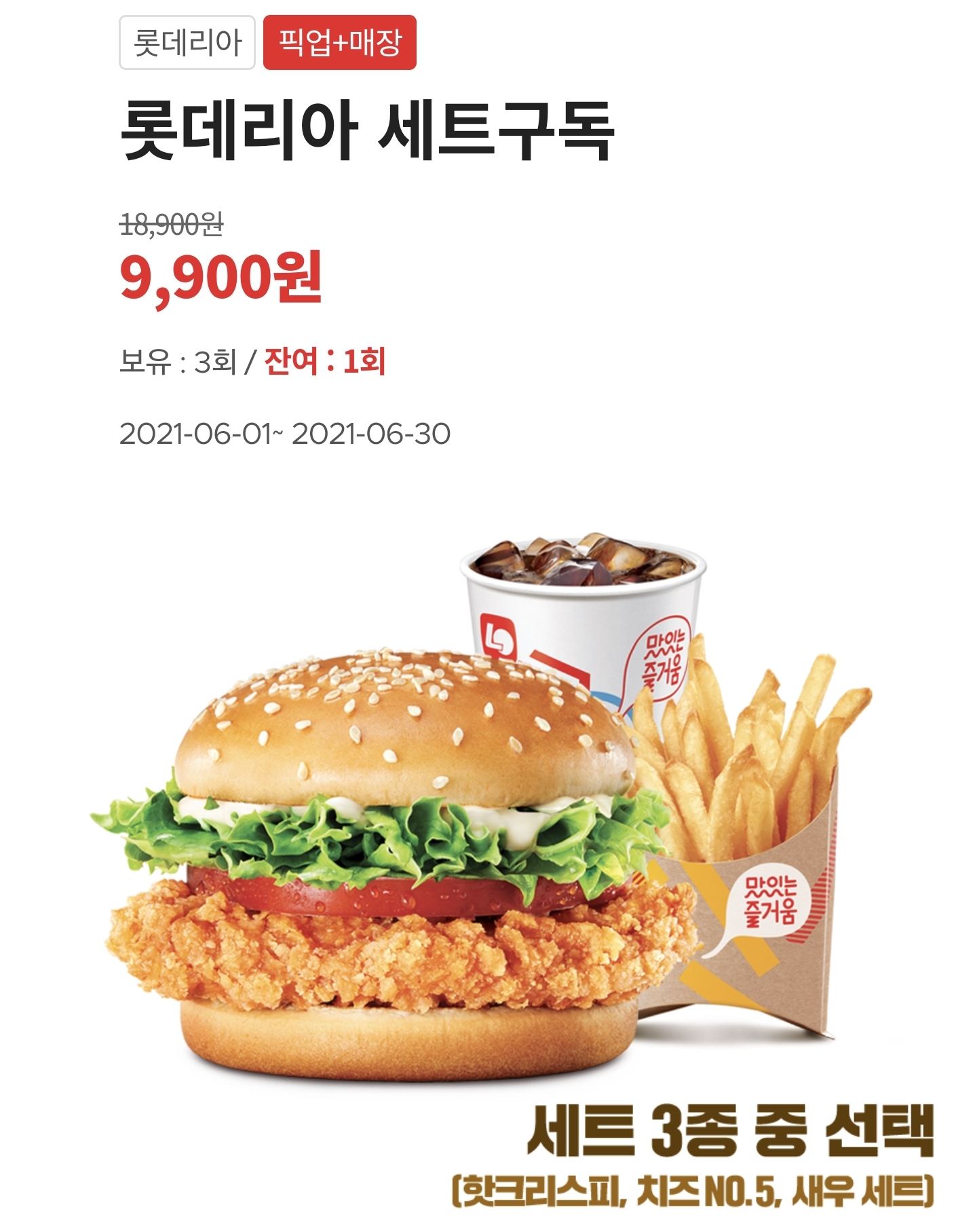 재작년에도 한번 걸렸던것 같은데 올해도 당첨되었습니다. 그래서.. 작은 나눔을 할까 합니다 롯데잇츠 구독권이 1회 남았는데 핫크리스피, 치즈NO5, 새우버거 세트중에 교환 가능, 6월30일까지 이며 매장방문시만 사용가능합니다.(픽업원하시면 제가 대리주문하고 찾으러 가셔야 합니다.) 11시 50분에 추첨하겠습니다.