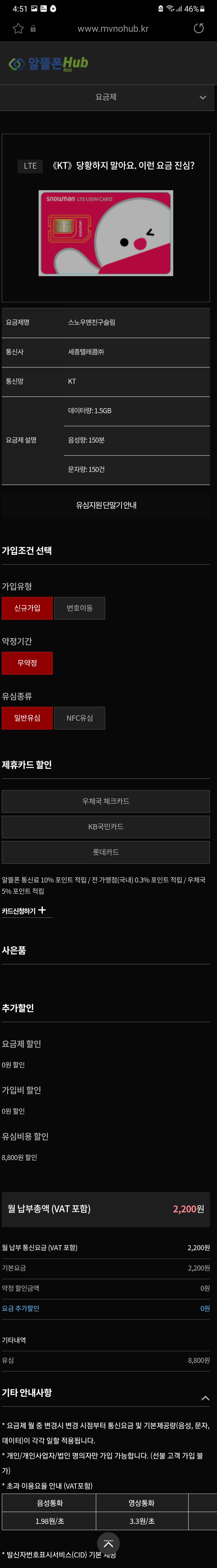 1.5기가 150분 150건 평생 2200원.유심무료