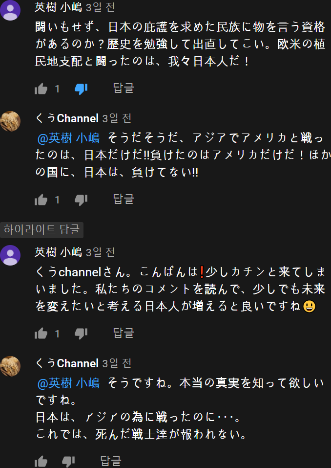 역사를 공부해서 다시 나와. 구미(欧米; 유럽 미국)의 식민지 지배와 싸운 것은 우리 일본인이다!