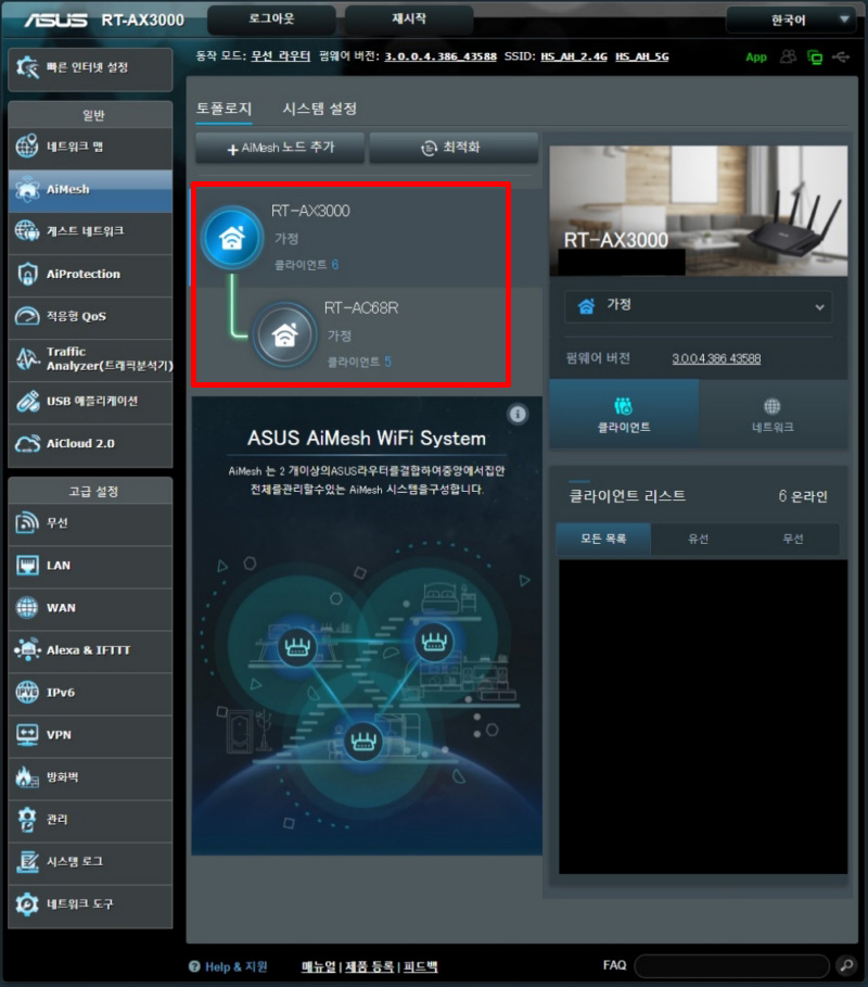 AiMesh는 ASUS 공유기만의 네트워크라 보시면 되는데 메인공유기를 라우터로 설정해서 와이파이 신호를 보내고