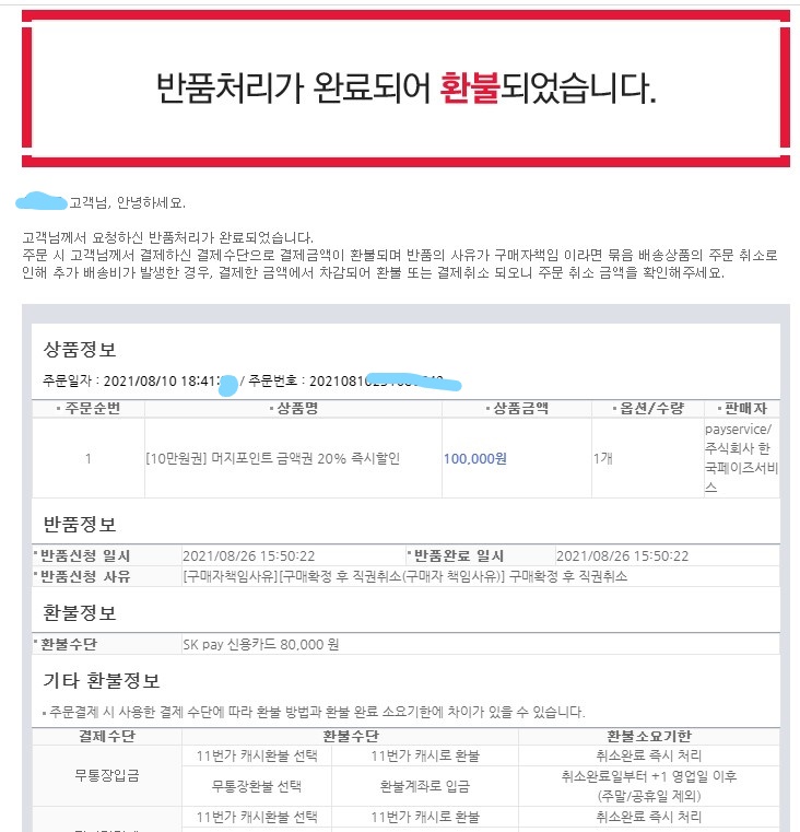 머지 포인트 11번가에서 구입한분들 환불 됩니다.