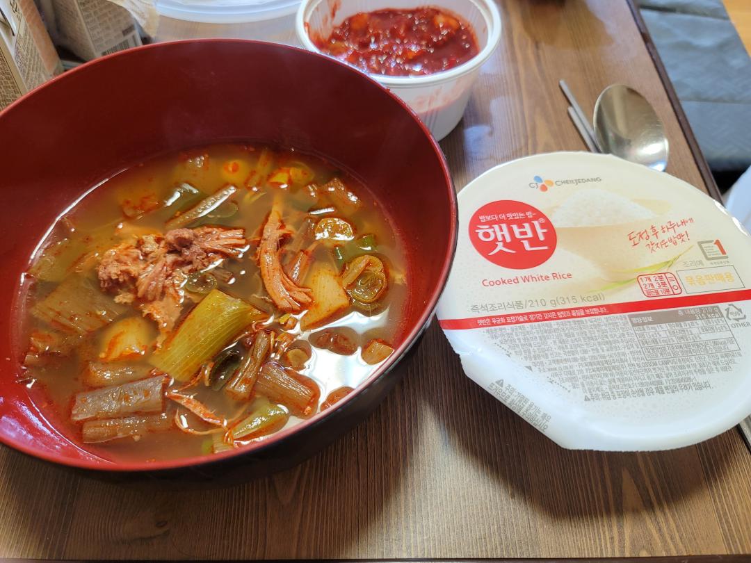 어제 냉동 토종순대 쪄서먹고 그 빈자리에 냉동 육개장 5봉 채웠는데 그 중 1봉을 꺼내어 해동시킨뒤 끓여먹었는데 맛이 괜찮네요~