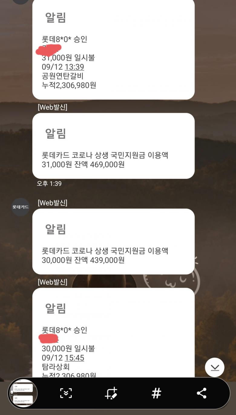 장보는거 빼고는 은근히 쓸 수 있는데 많네요. 커피랑 약국, 편의점에서 담배 사는데 냐곰냐곰 쓰고 있습니다. 연말까지라고 하니 이 속도라면 서두르지 않아도 다 쓰는데는 문제 없을거 같더군요. |