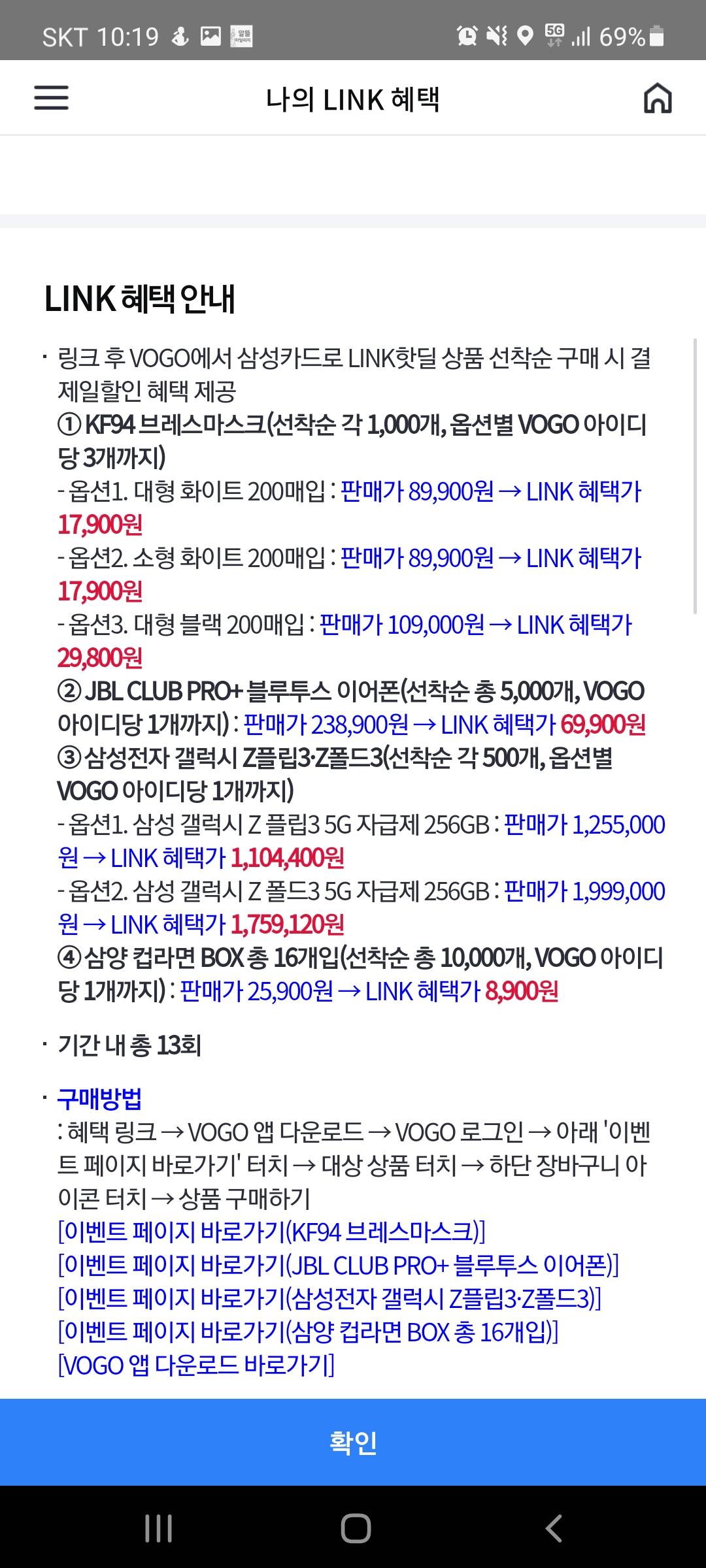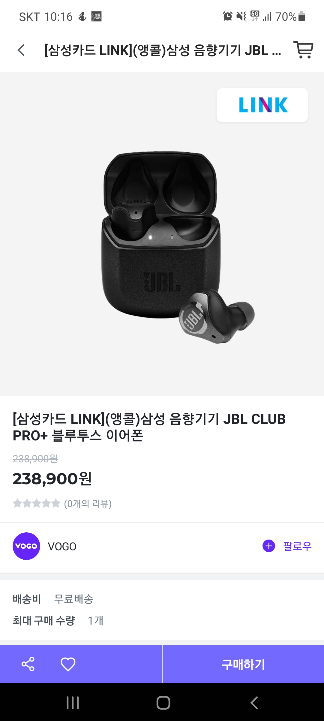 VOGO앱에서 JBL 블투 이어폰을 판매중인데 삼성카드 LINK 혜택추가하면 69,900원이 됩니다..