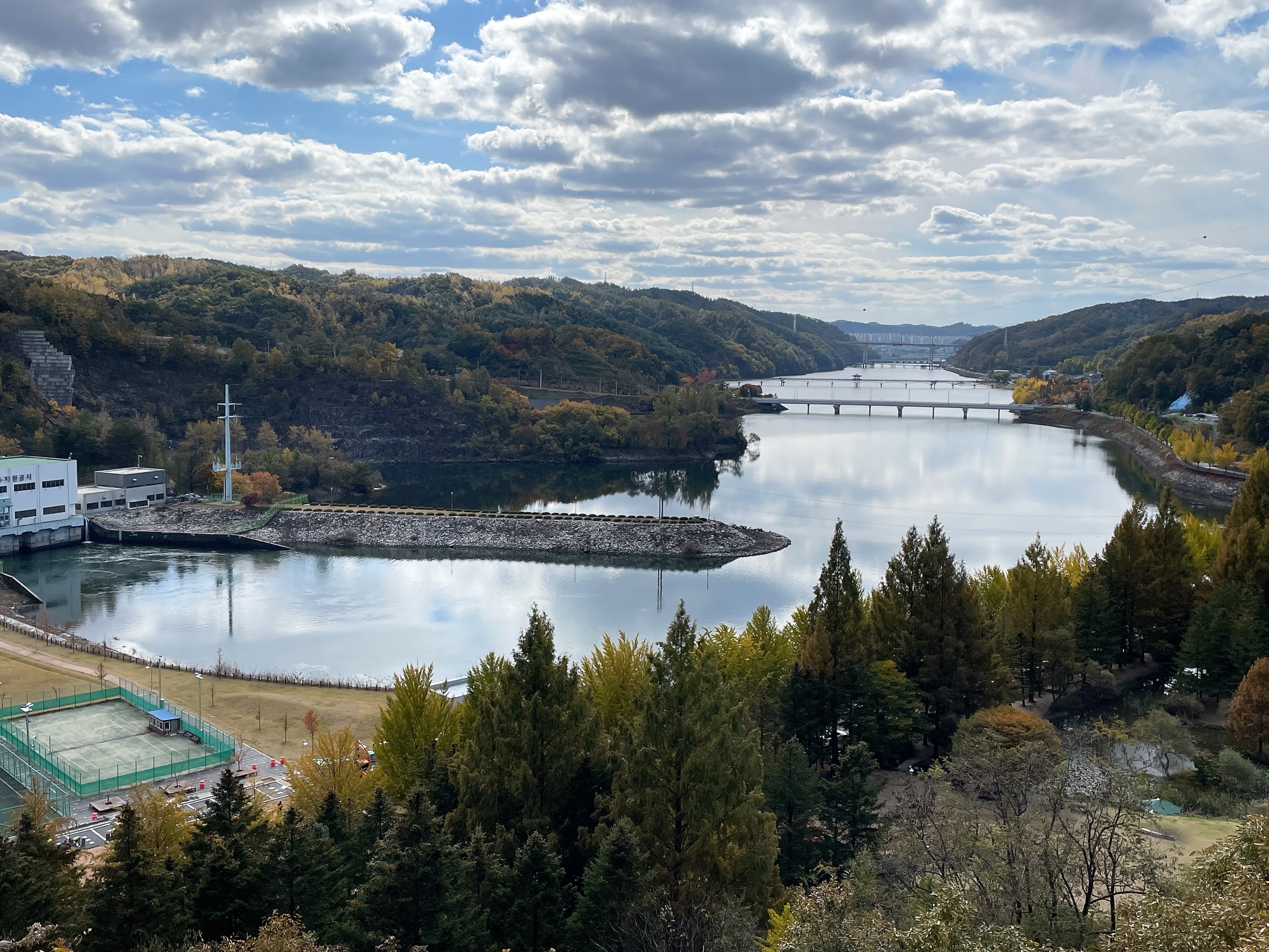 안동댐 정상에서 바라본 월영교 방면 풍경입니다.