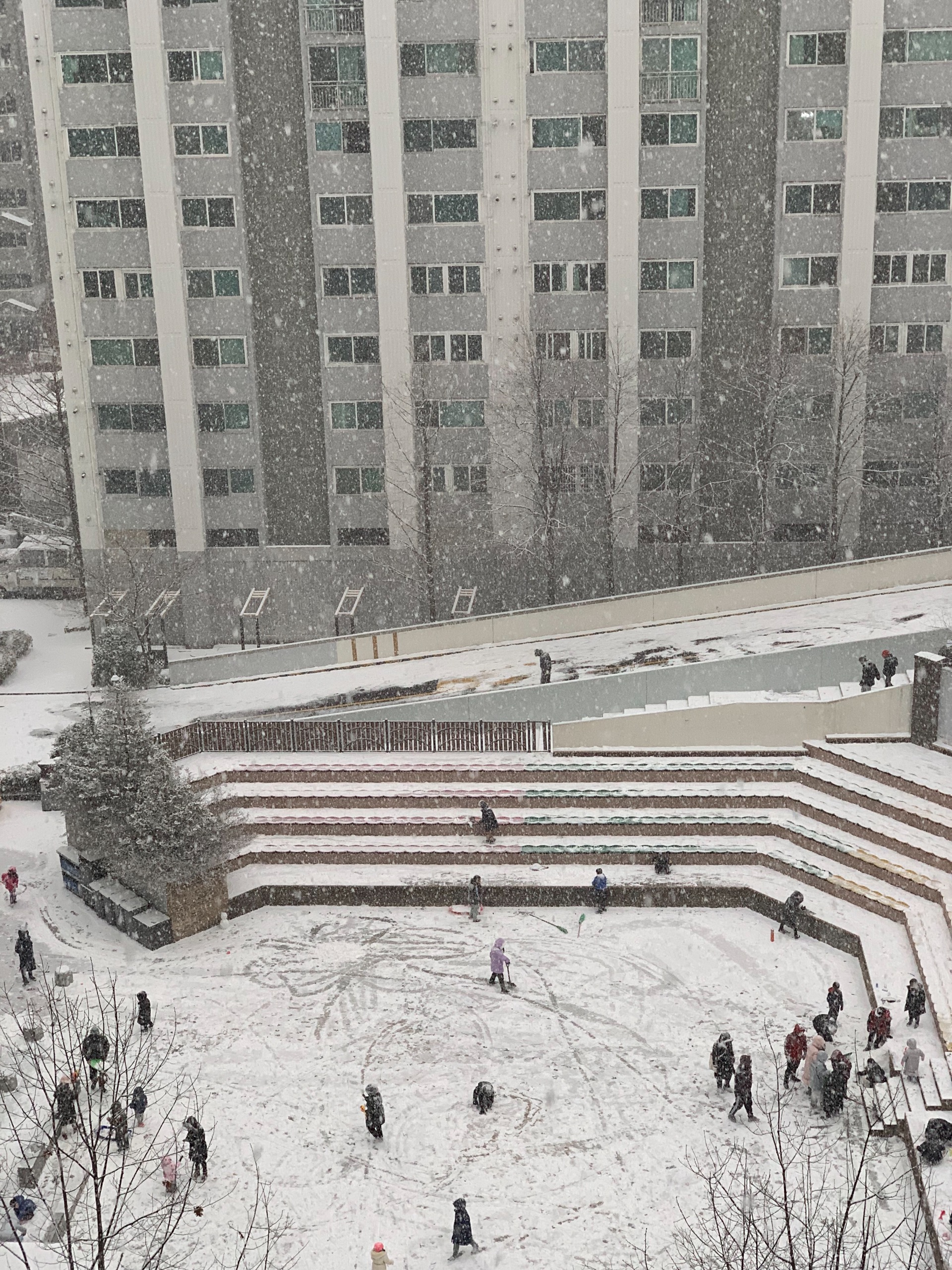 미친듯이 눈 내렸네요.. 눈싸움하는 애들 보이더라구요. |