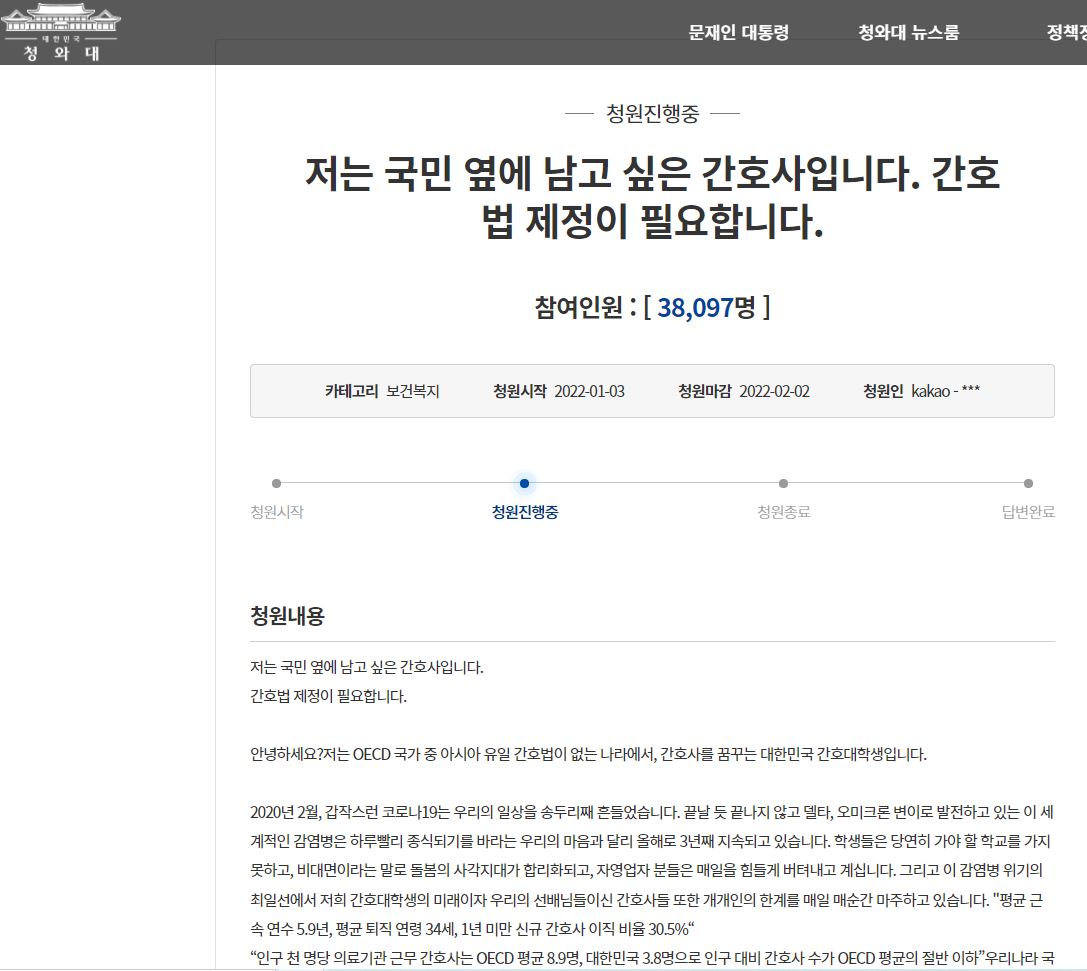 저는 국민 옆에 남고 싶은 간호사입니다. 간호법 제정이 필요합니다. > 대한민국 청와대 (president.go.kr)