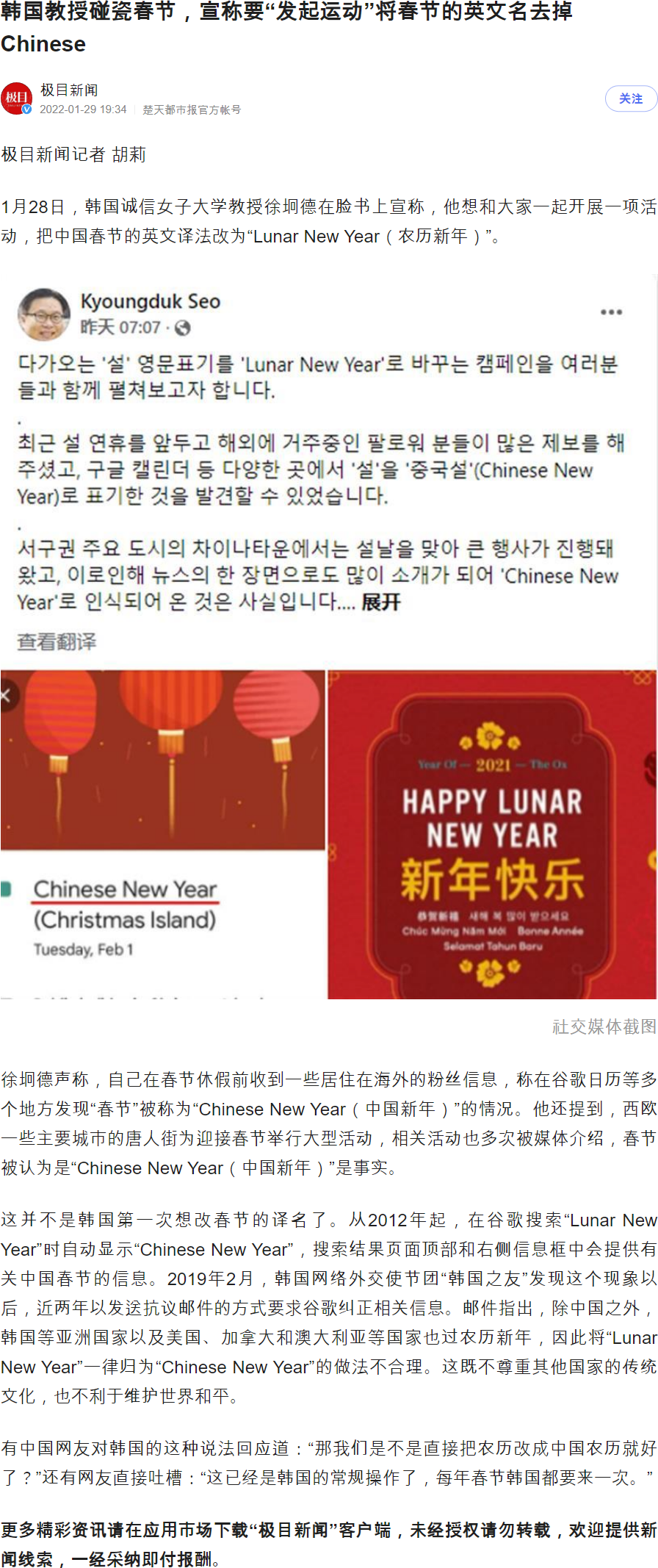 韩国教授碰瓷春节,宣称要“发起运动”将春节的英文名去掉 Chinese