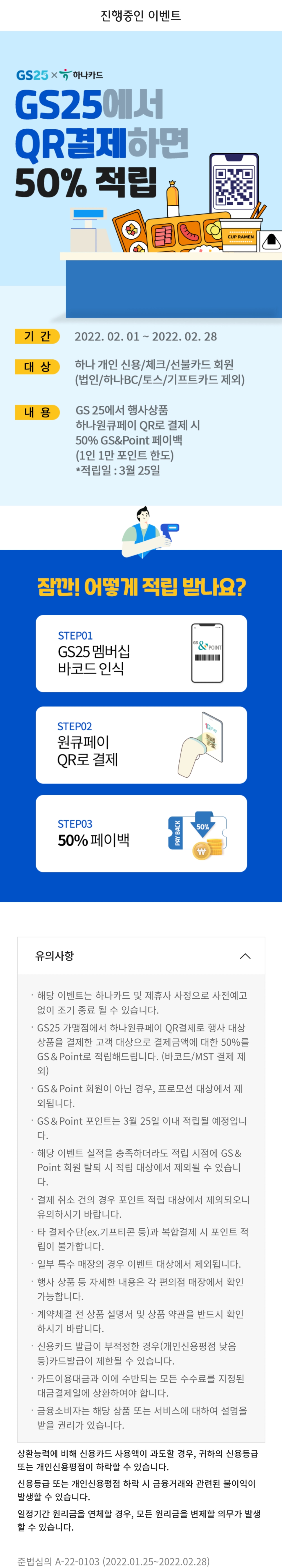 내일 모레부터 다음달 말까지(2/1 ~ 28) 하나 원큐페이로 QR결제를 하시면 제목에 쓰인대로 GS포인트 50%를 적립해준다고 하네요~