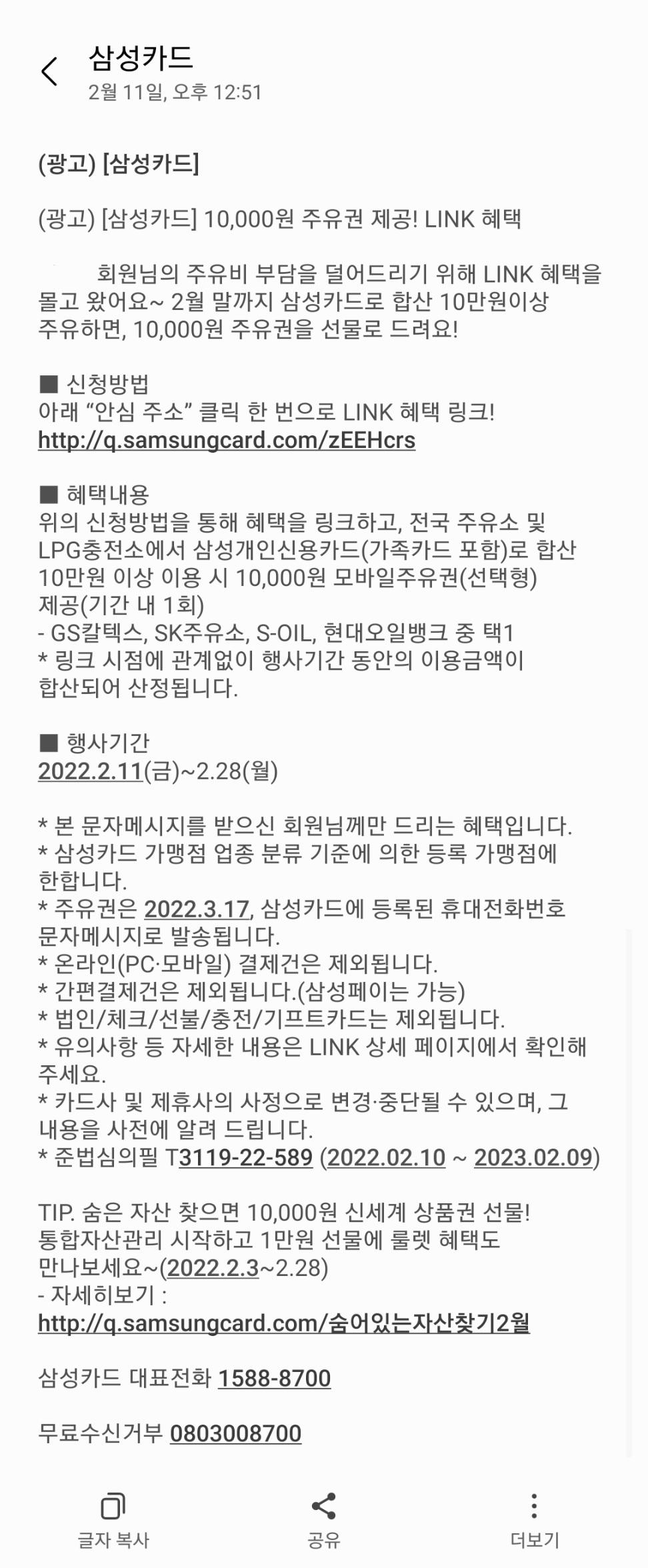 약 30분전에 문자를 확인해보니 삼성카드로 10만원 이상 결제시 1만원 (선택형)주유권을 증정한다는 내용이 있더군요~