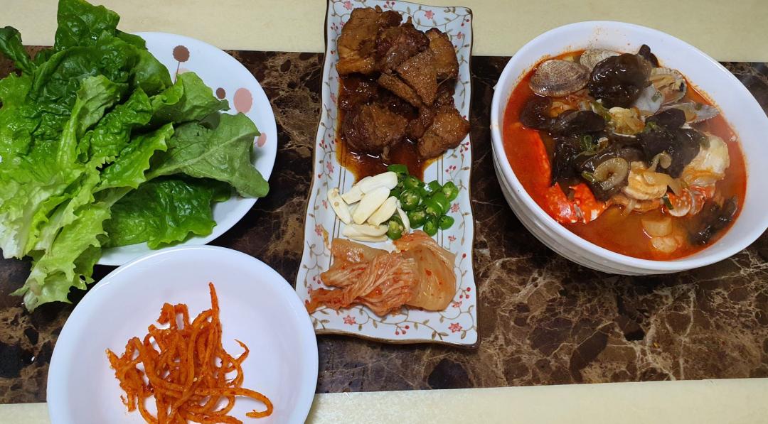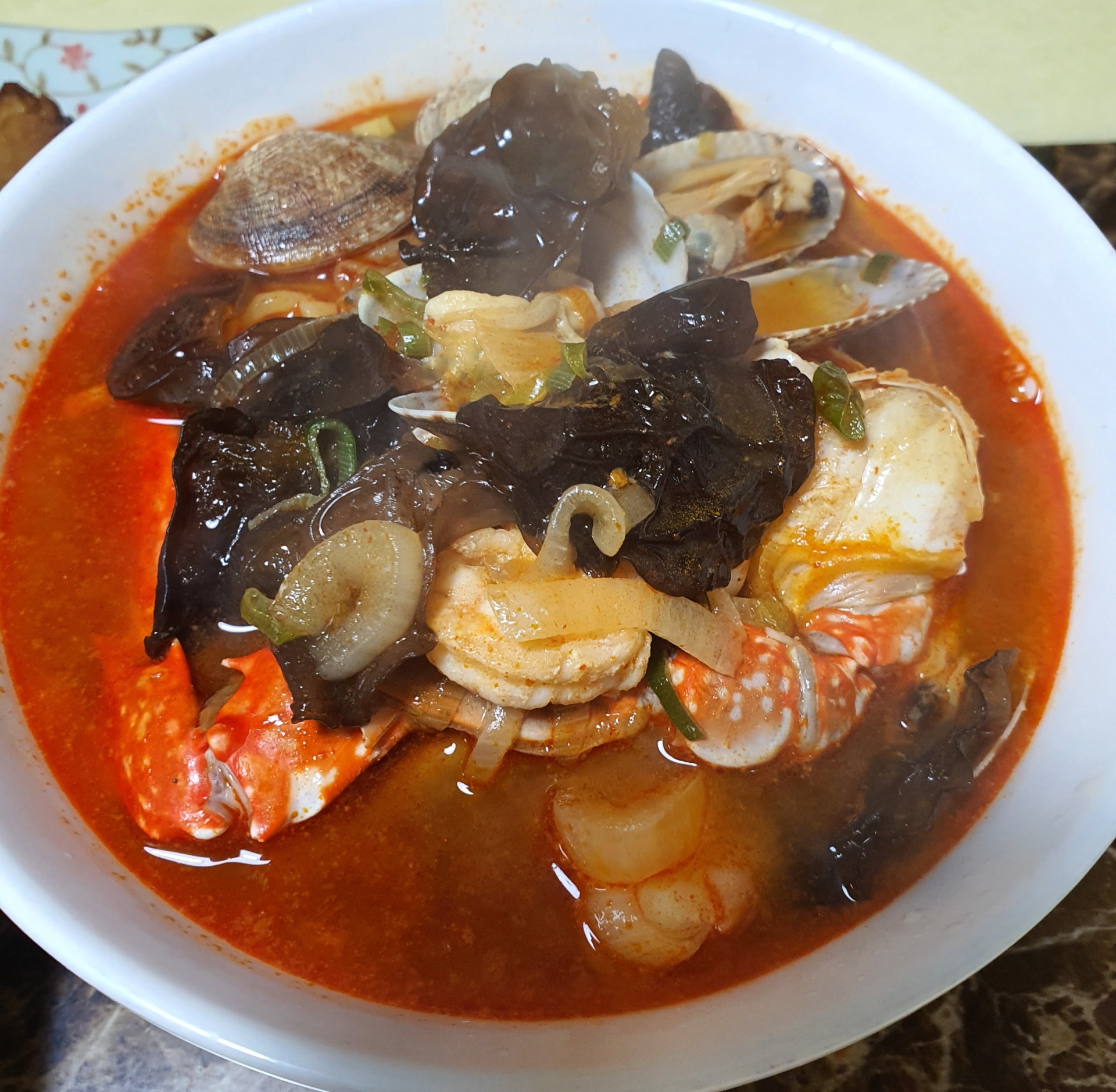 냉동 꽃게랑 바지락 새우가 있어서 말린 목이버섯 넣어서 만들었네요..청경채가 없어서 아쉬웠네요..