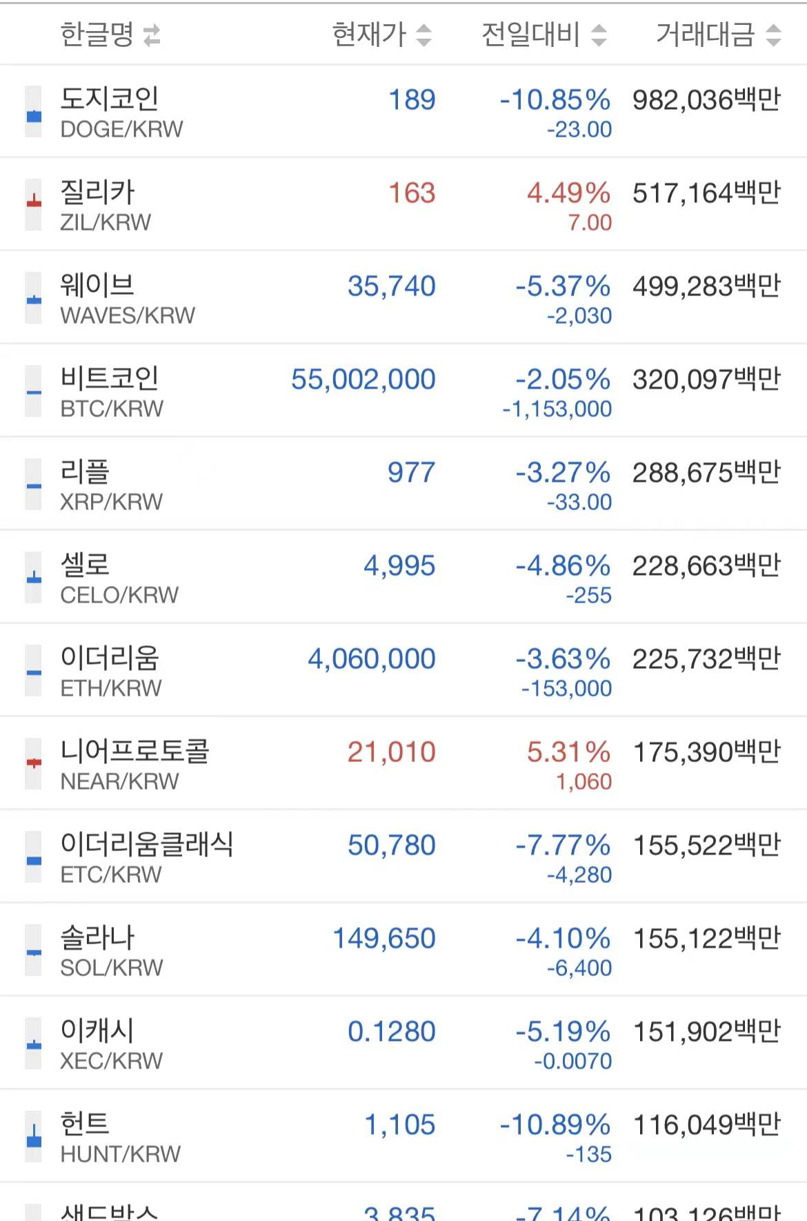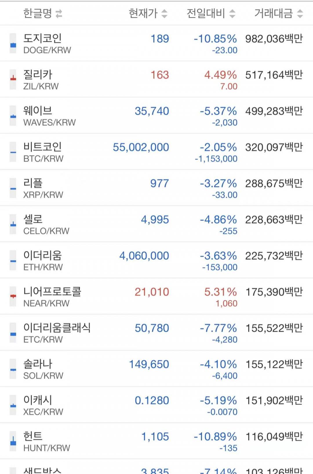 코인 전부 파란색이네요..