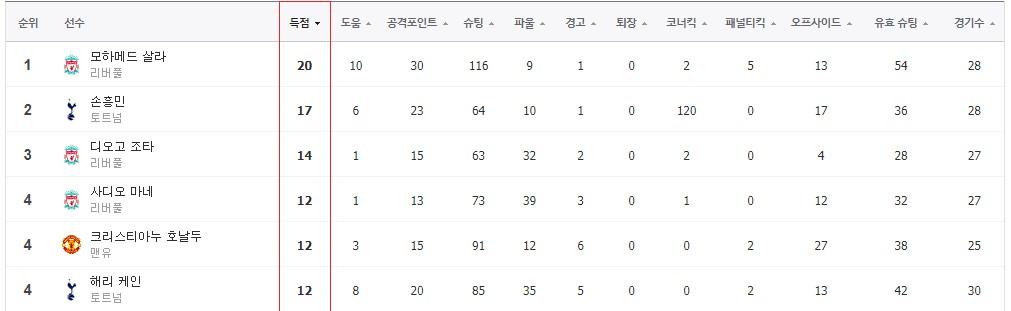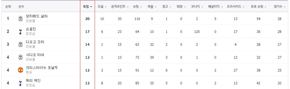 살라 20골에 이어 리그 득점 단독 2위로 올라섰네요.