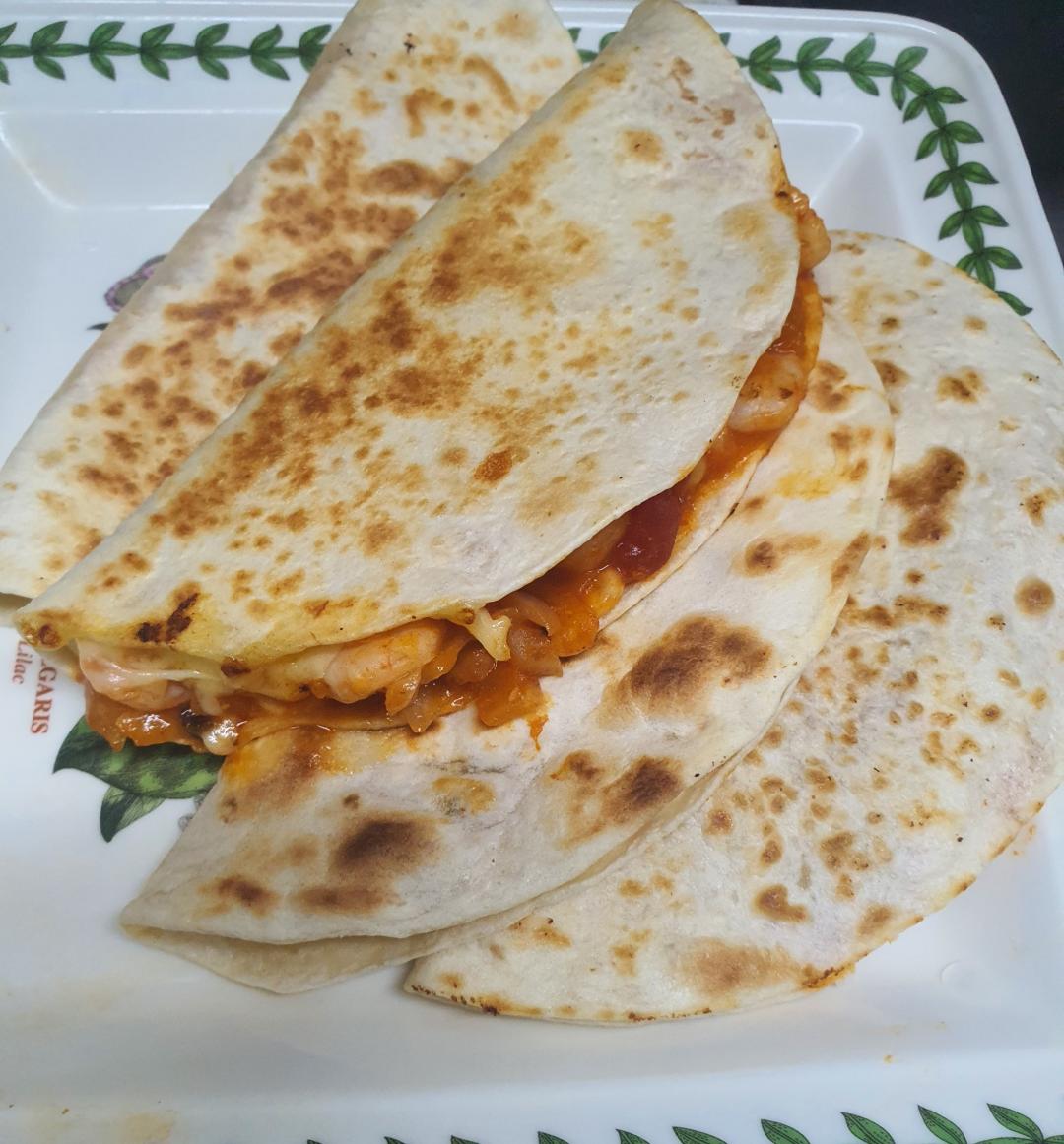 오전에 이마트에서 또띠아 사다둔걸로 퀘사디아 만들었네요..돼지불고기에 양파다지고 옥수수알갱이 넣어서 토마토소스 넣고 볶아서 또띠아 위에 올리고 피자치즈 위에 뿌린후 반으로 접어 후라이팬에서 노릇하게 구웠네요..